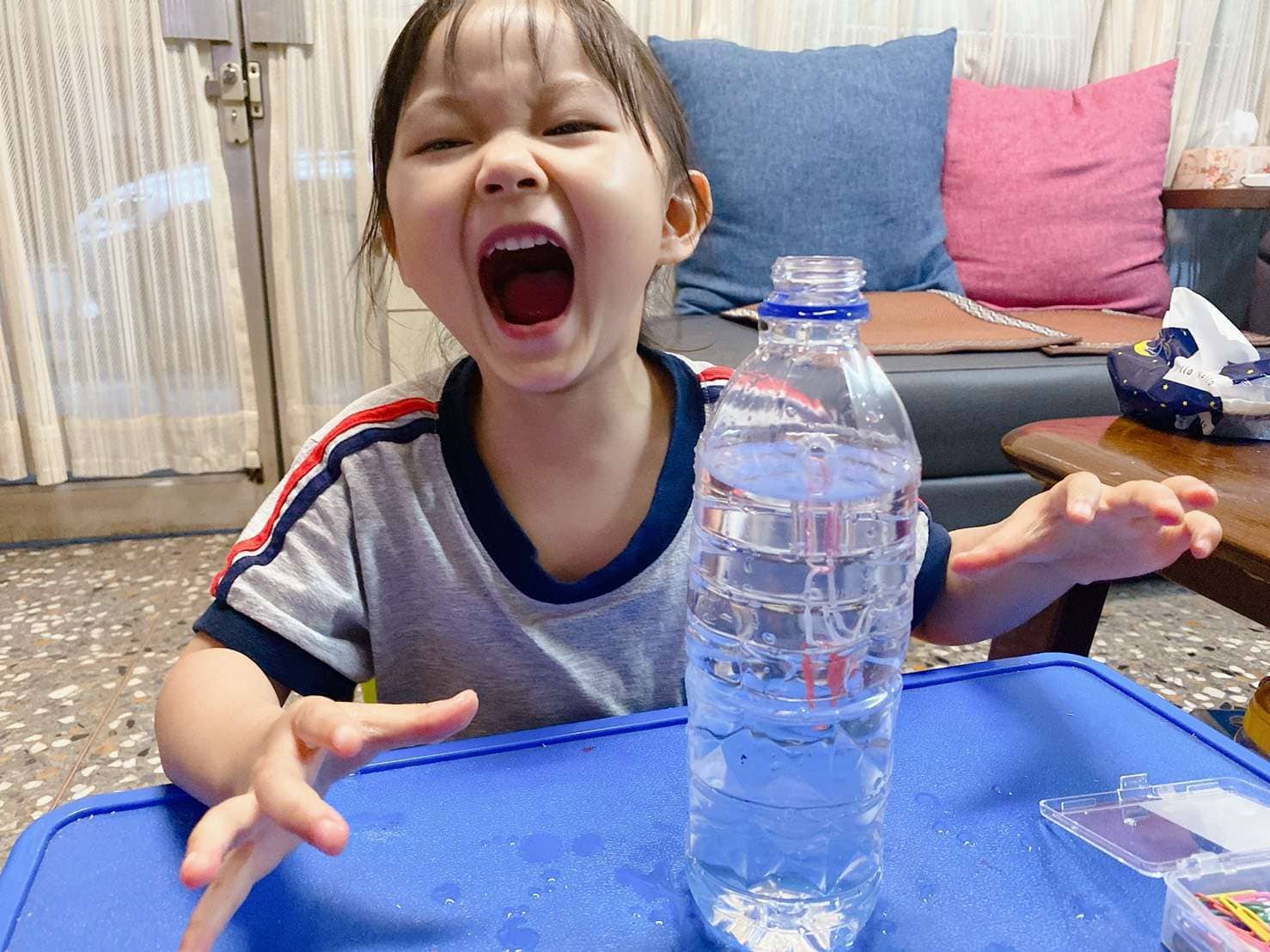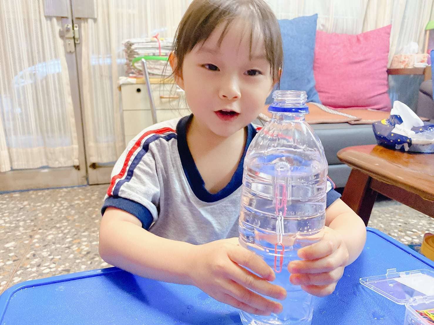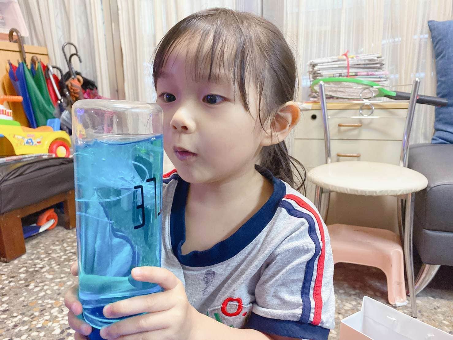 另外一個玩法就是會轉彎的吸管剪下來,插入迴紋針,就可以在水上浮起來,寶貝在擠壓寶特瓶之後會上下的跑動,我們瓶蓋關起來的效果不佳,改成開蓋玩,寶貝玩得更開心