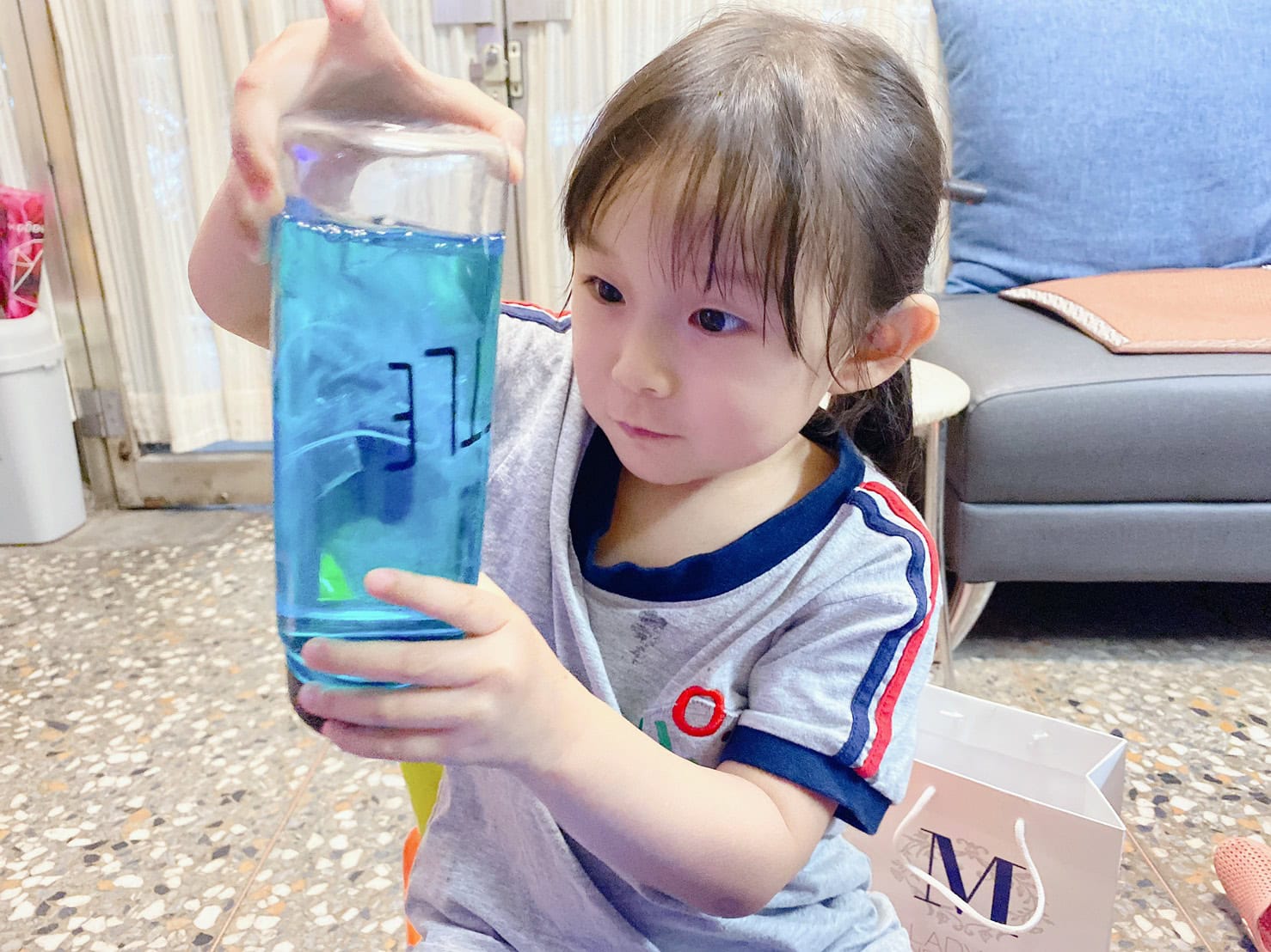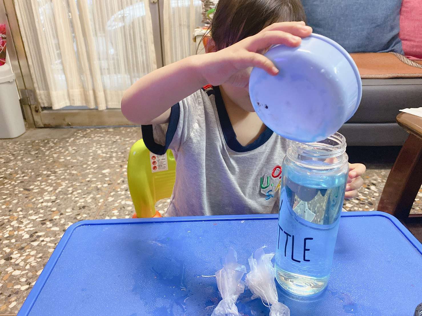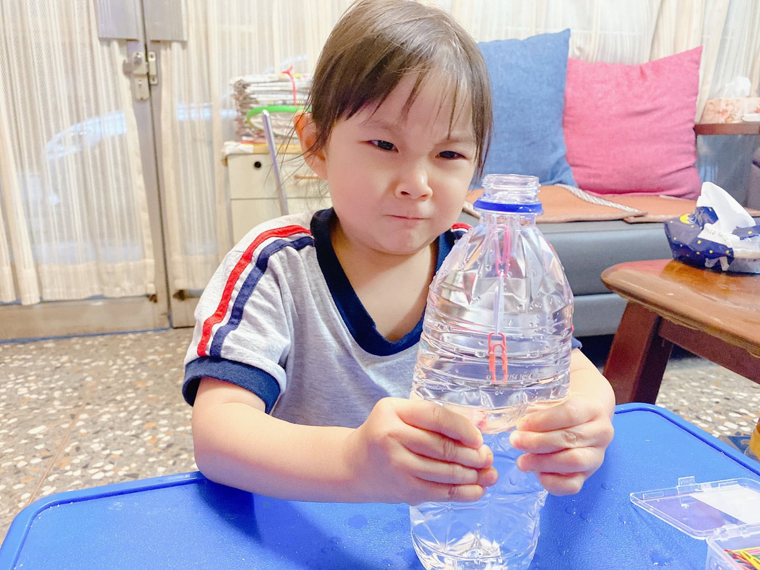 另外一個玩法就是會轉彎的吸管剪下來,插入迴紋針,就可以在水上浮起來,寶貝在擠壓寶特瓶之後會上下的跑動,我們瓶蓋關起來的效果不佳,改成開蓋玩,寶貝玩得更開心