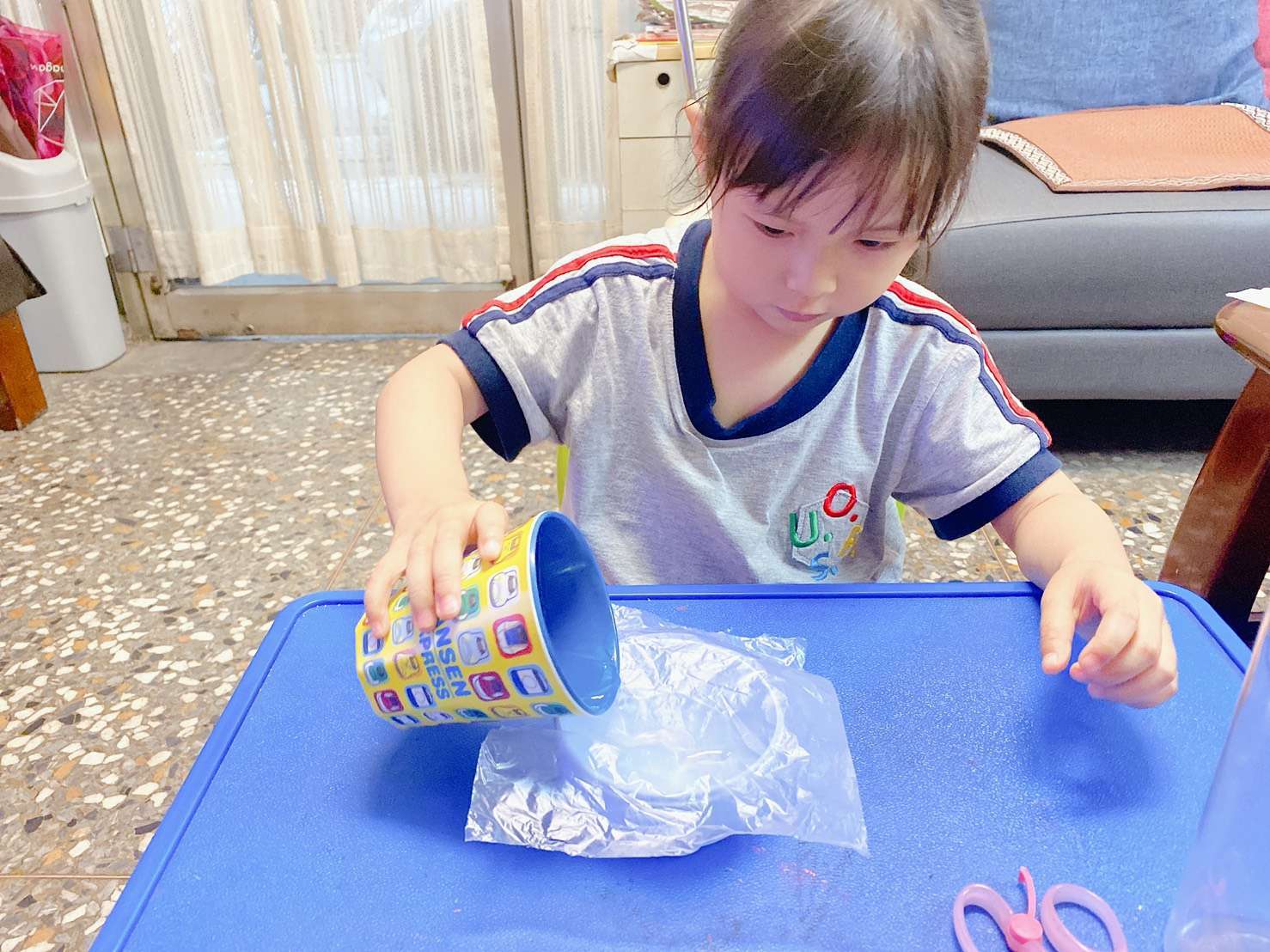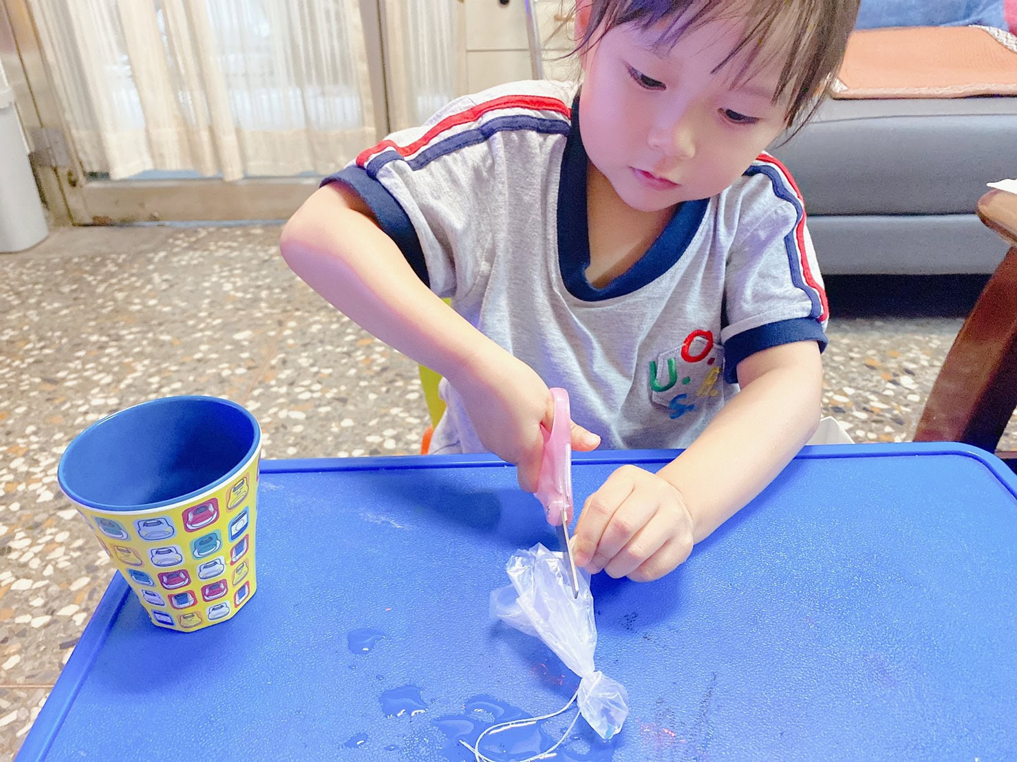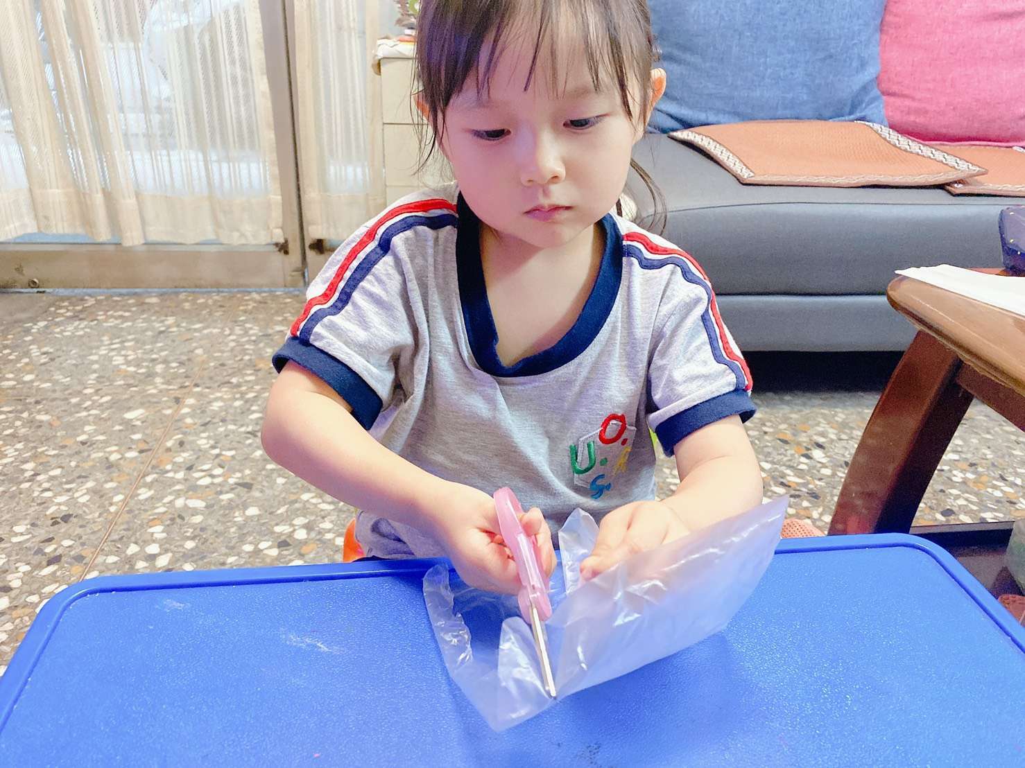 先請寶貝將塑膠袋剪開,練習剪不同的材質可以訓練小寶貝的手指靈活度