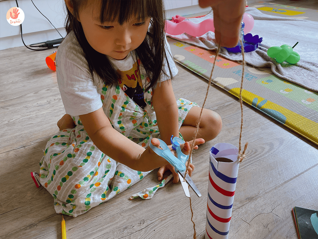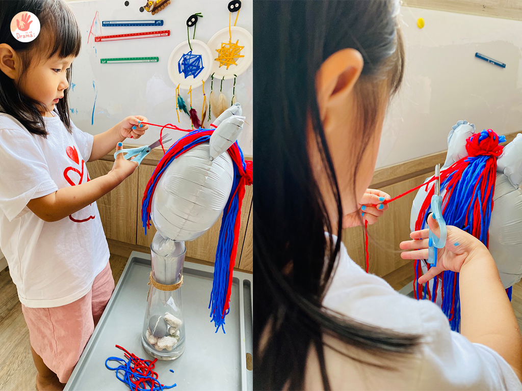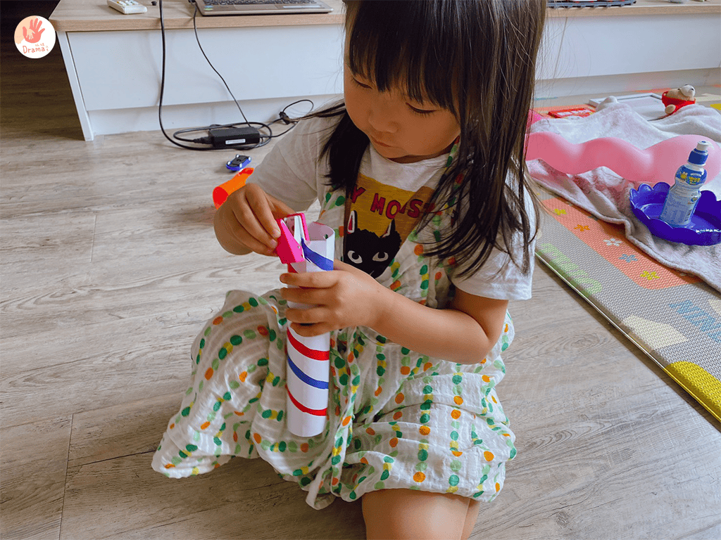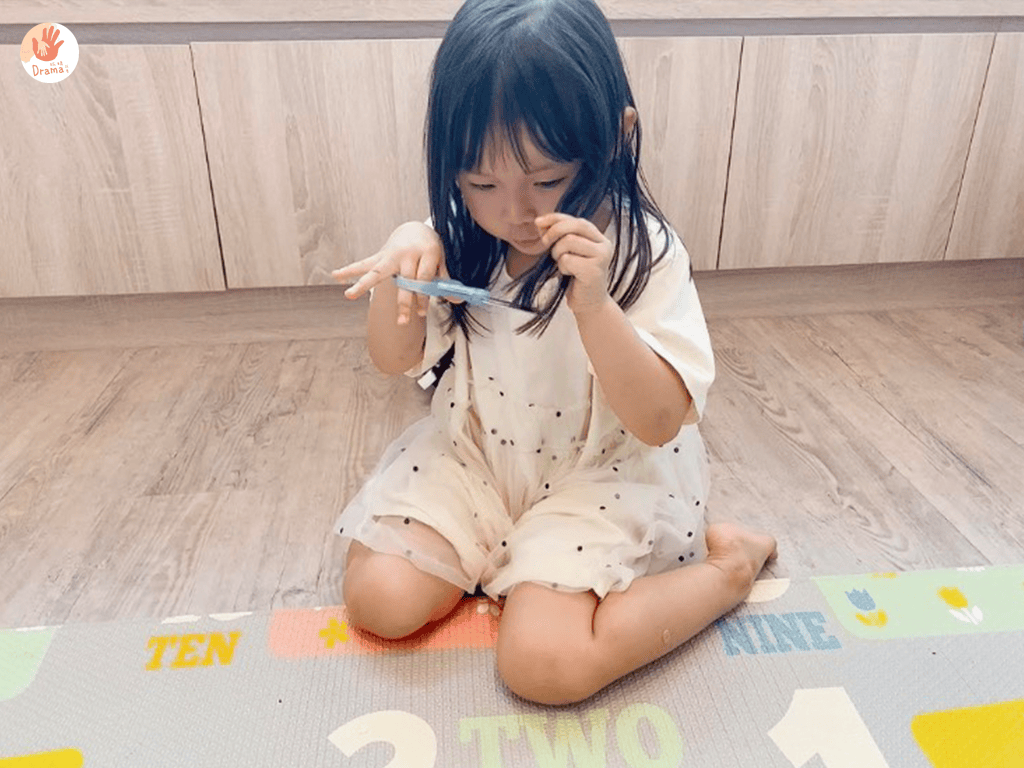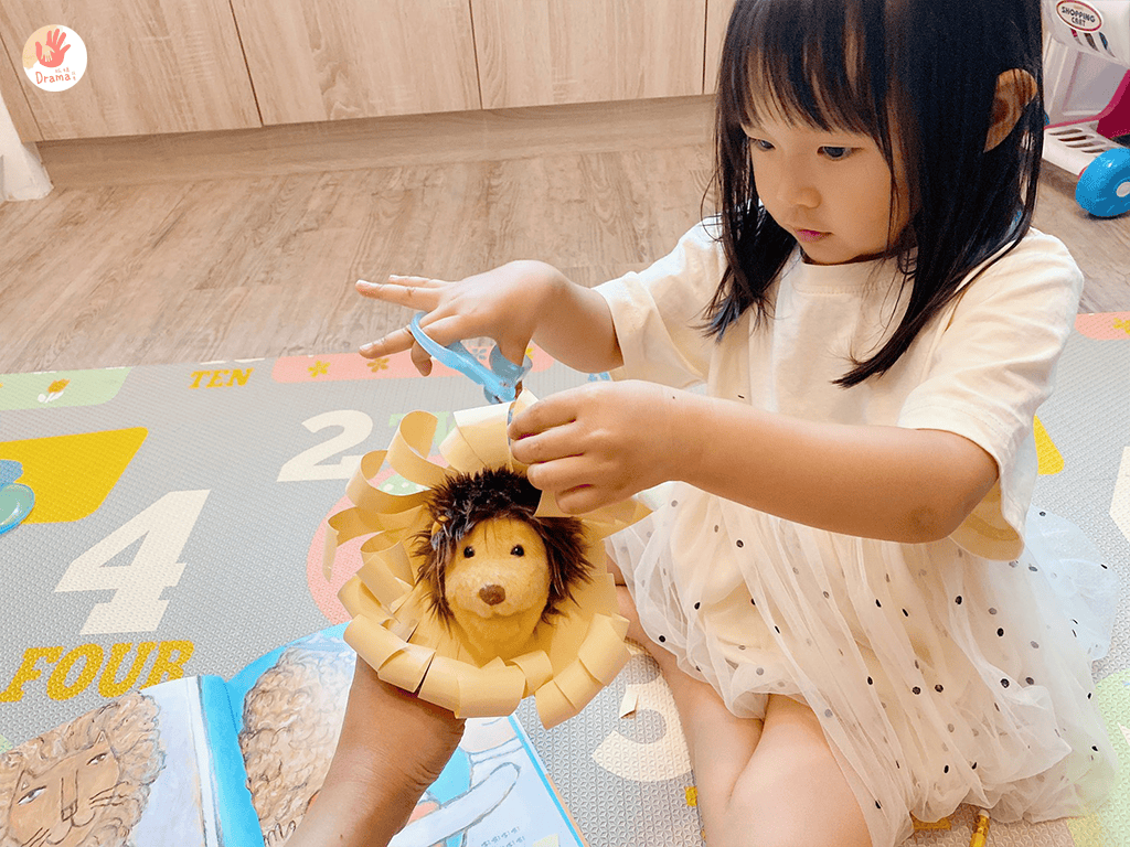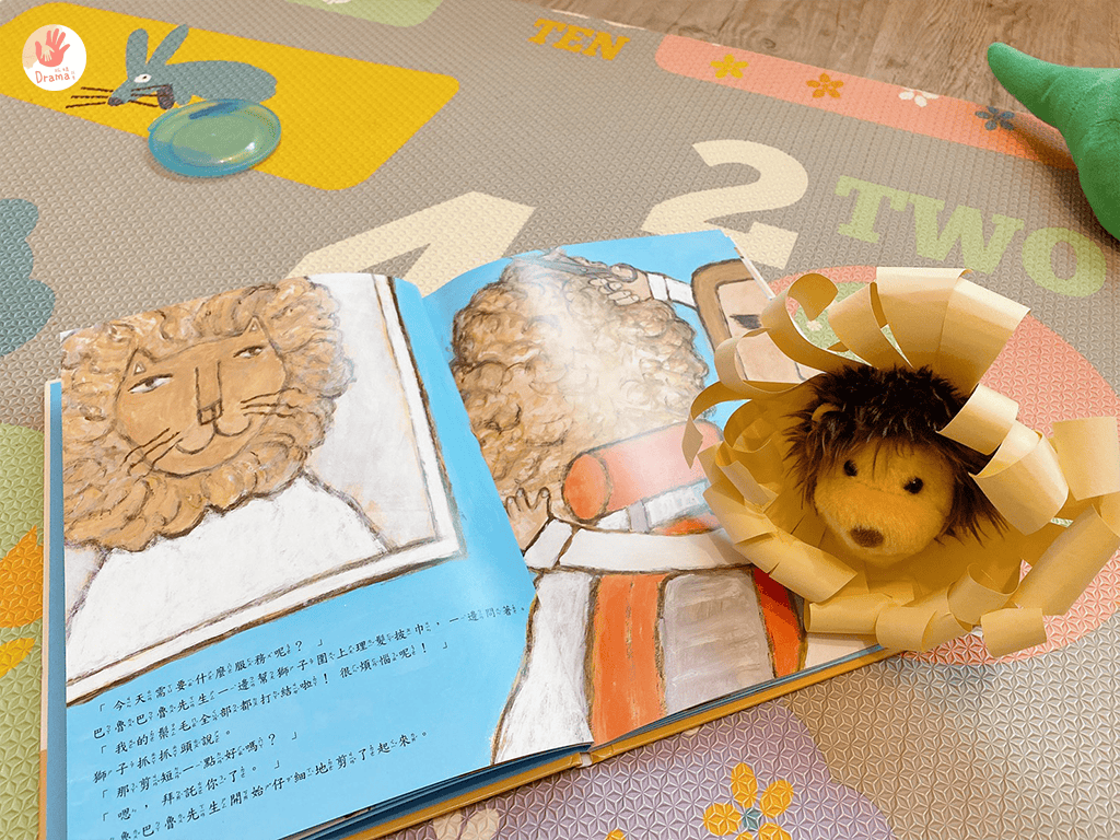 抓媽先用紙剪出一個圓,再剪成線條,套在獅子頭上,接著再用鉛筆把紙捲成Q毛樣,讓寶包把捲起來的部分剪掉,只能說理髮師這個角色孩子們真的很愛,玩的很投入