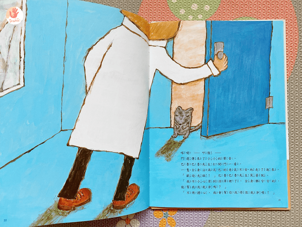 故事最後,來了一位小老鼠,理髮師幫忙洗完泡泡浴之後,才發現原來是松鼠