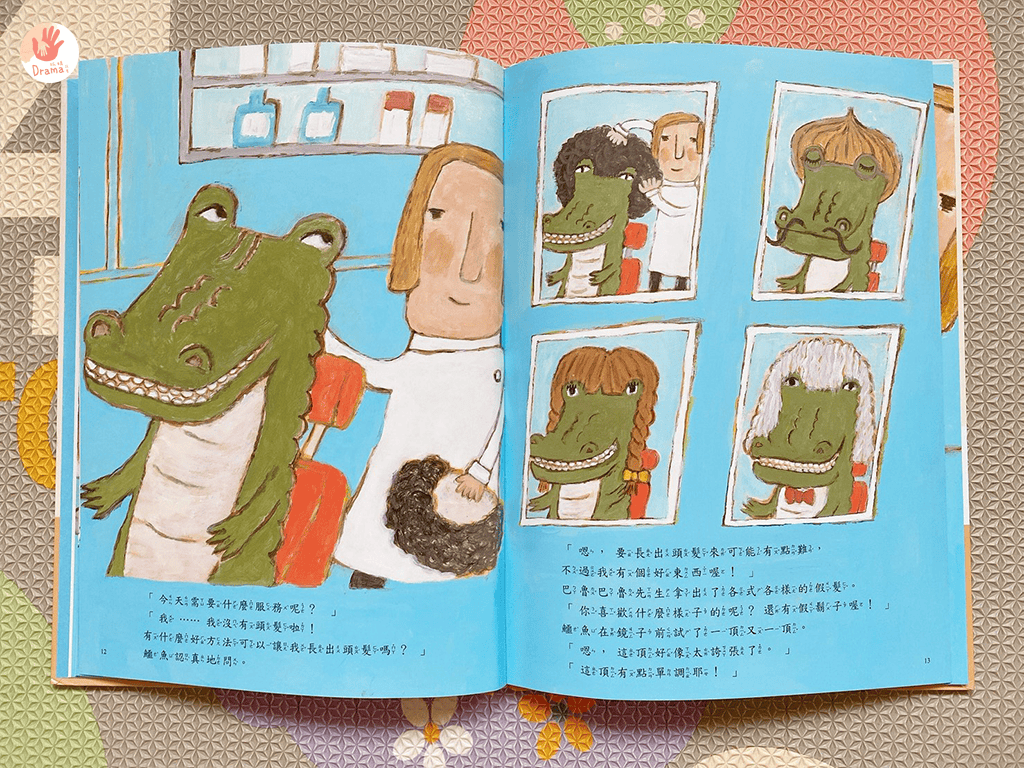 接下來一位客人是沒有頭髮的鱷魚,牠請理髮師幫忙讓牠也可以有頭髮的造型
