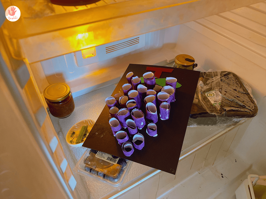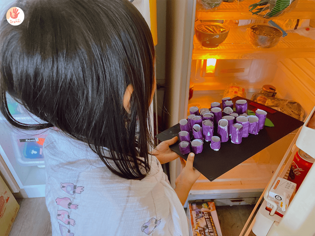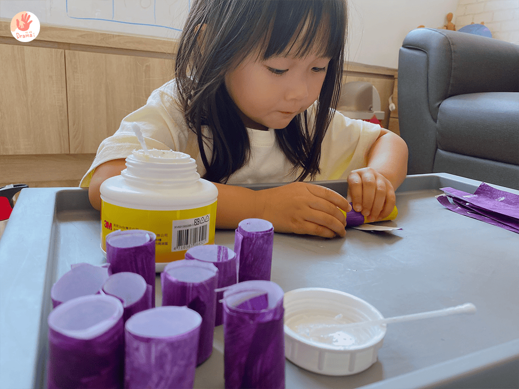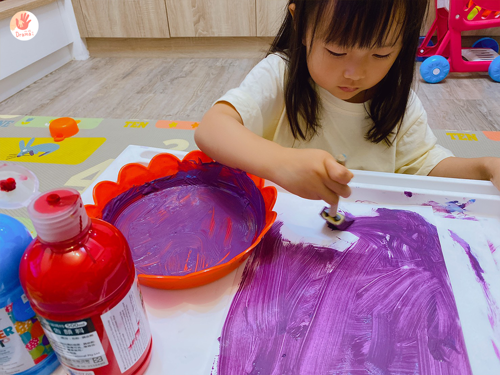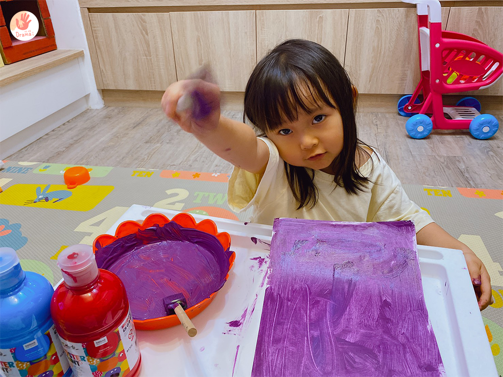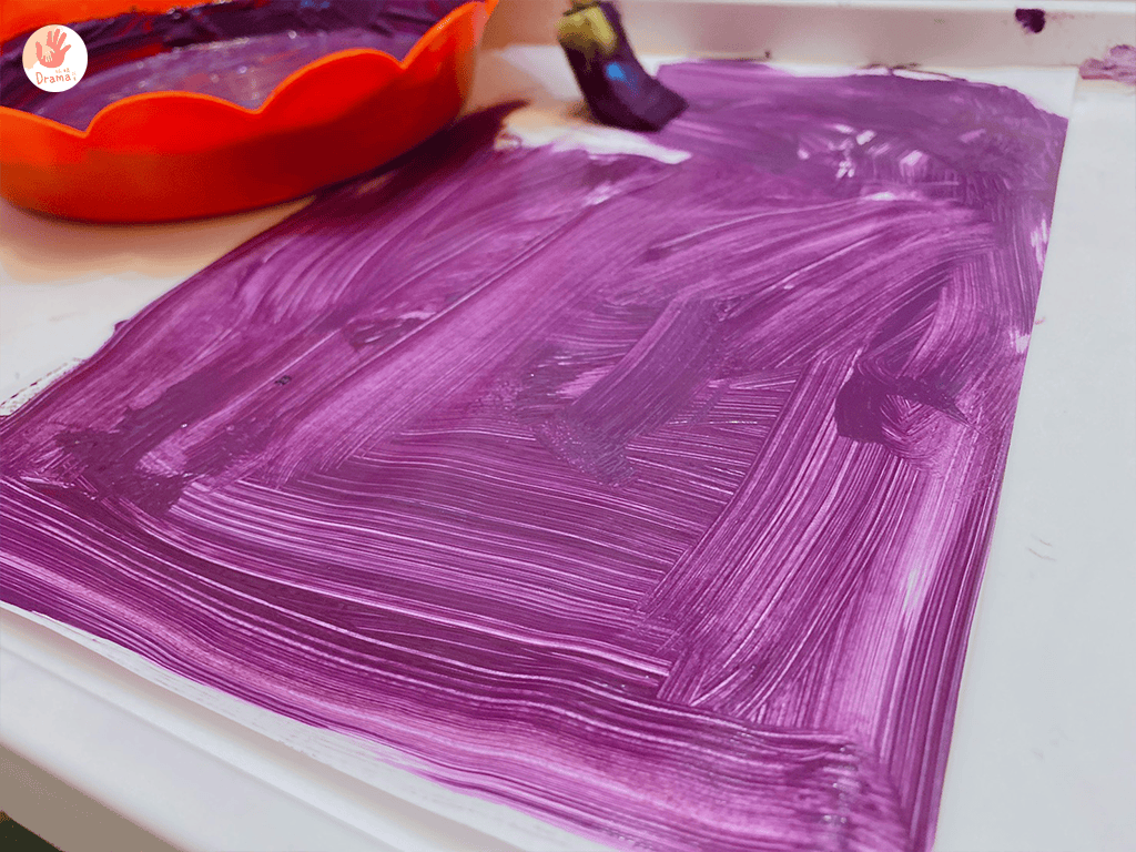 前一晚我們先用紅色和藍色顏料混色,把A4紙都塗滿紫色