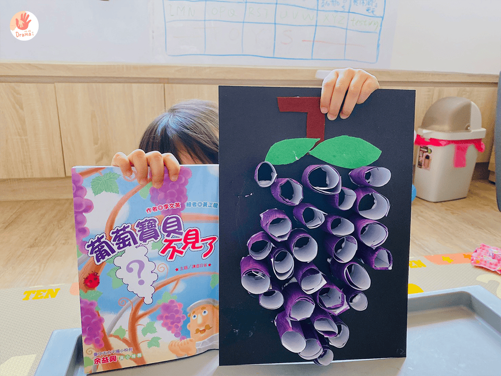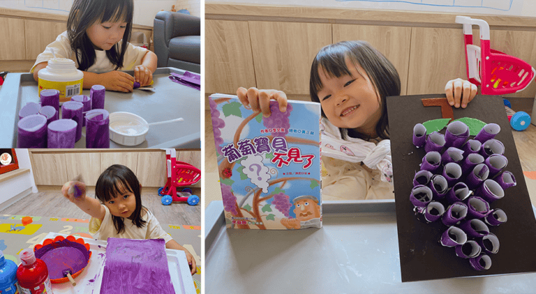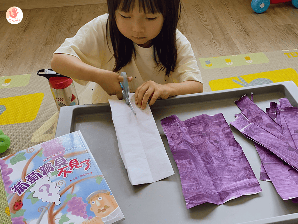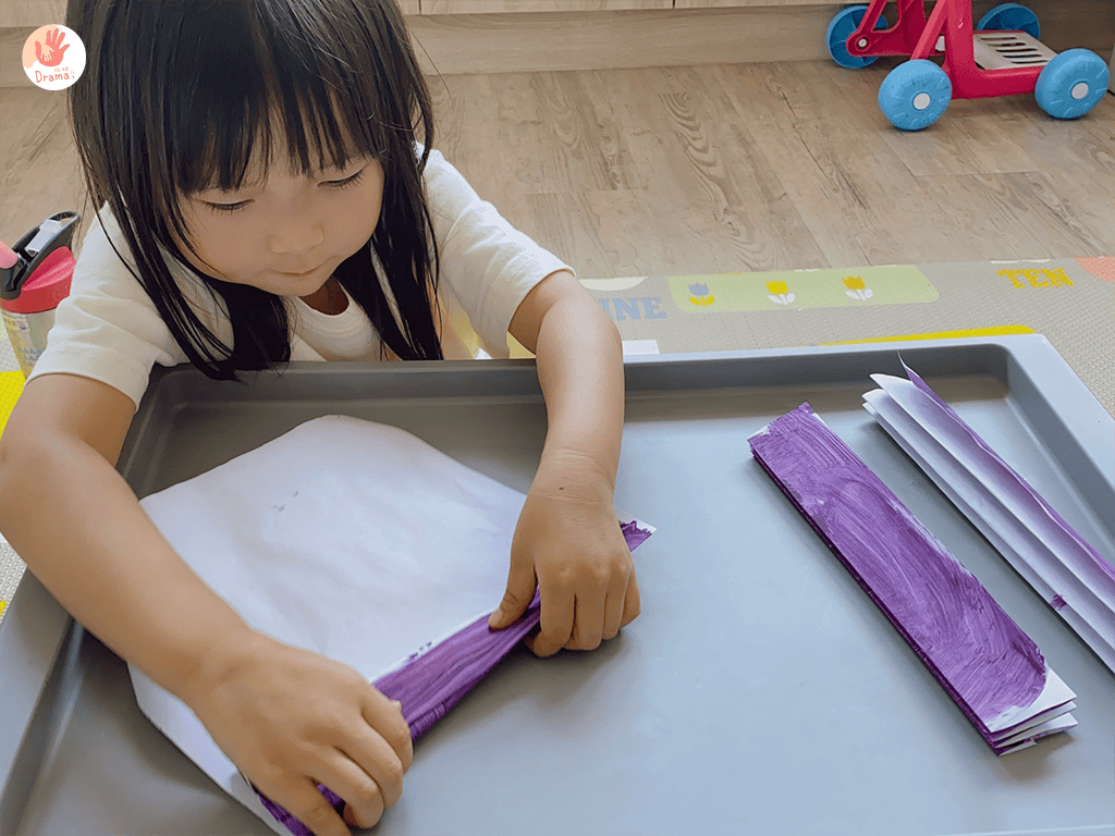 隔天起床就乾了,我們讀完繪本就開始DIY,請寶包先摺約三到四公分寬,來回正反摺,這個也難不倒寶包,就算寬摺的不一樣反而讓成品更像葡萄