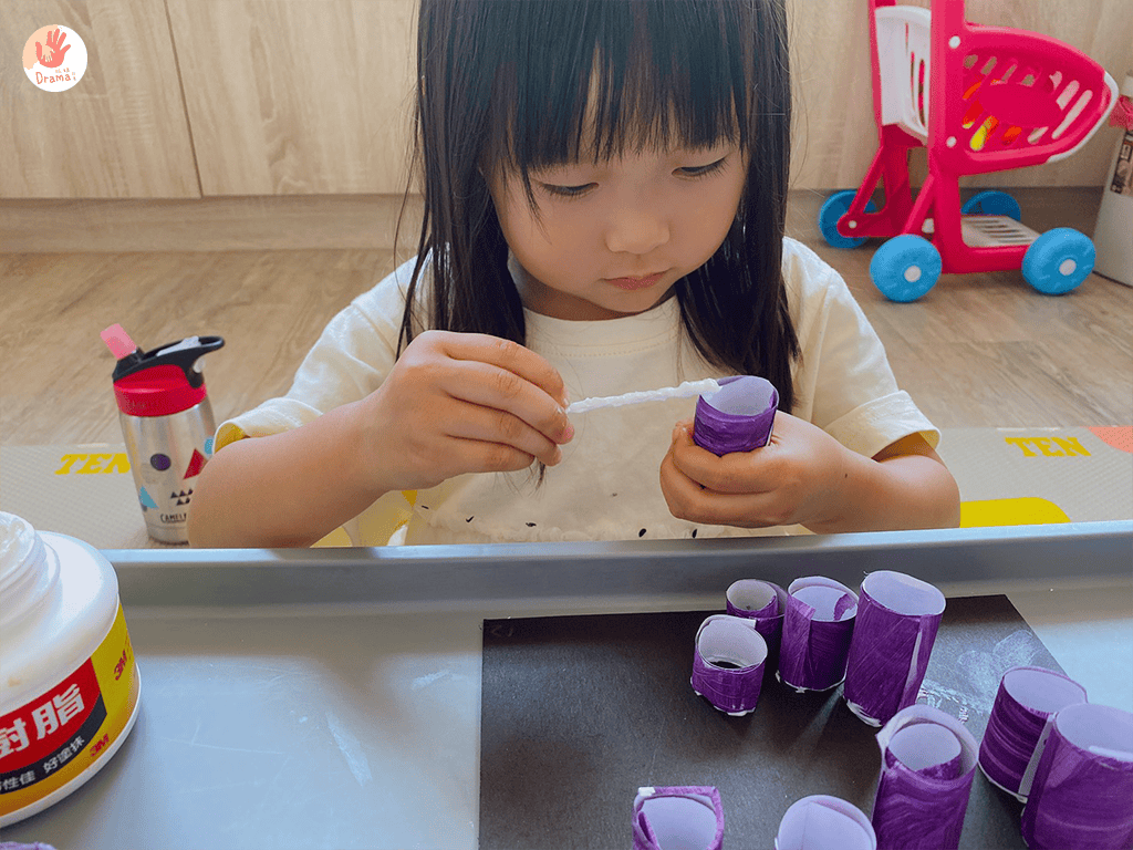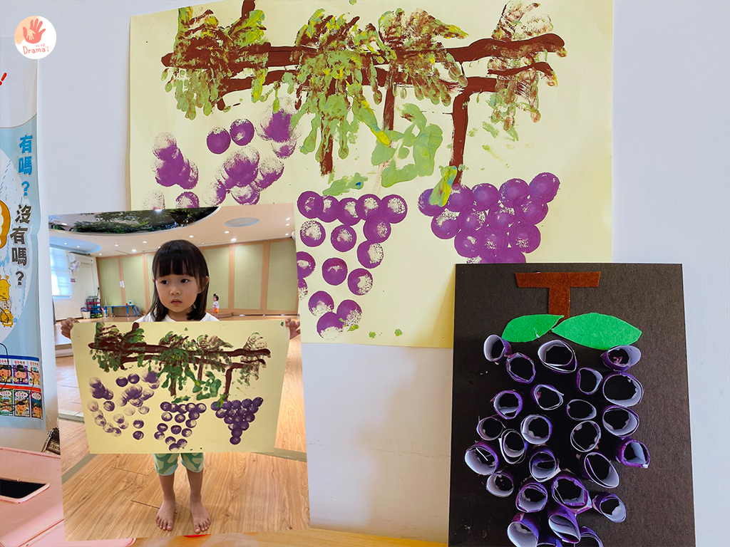 我在紙上畫了一個範圍,請寶包要把葡萄貼在線裡面,這個貼法除了可以像抓媽一樣立著貼,也可以是平放的方式貼,就是紫色面朝上,但因為朝上貼就不是圓型,視覺上我更喜歡是立著的方式