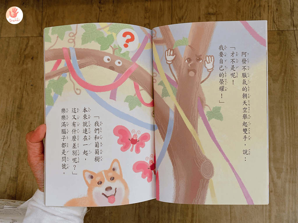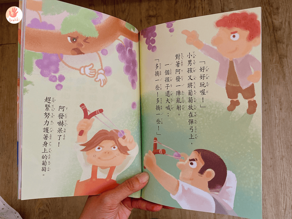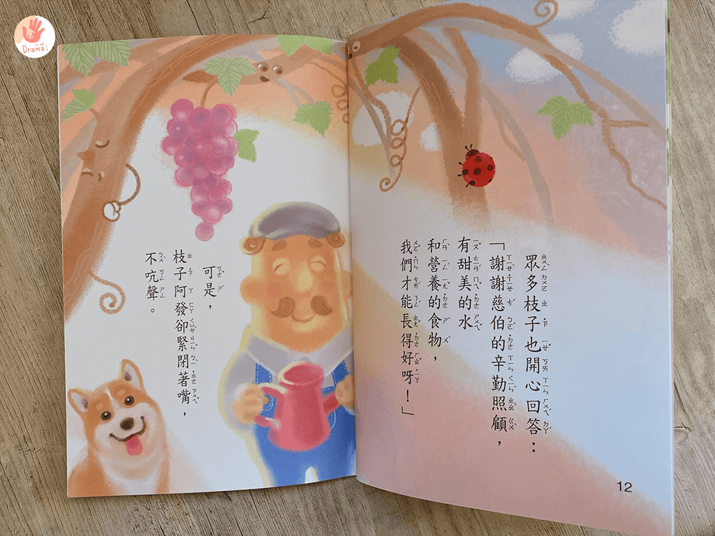 繪本[葡萄寶貝不見了]讀完會有淡淡的哀傷,故事描述葡萄阿北都用心栽種葡萄樹,但是葡萄樹的其中一個樹枝竟然非常的驕傲難相處,它覺得自己才能長出葡萄,但葡萄阿北都只照顧樹幹,有一天來了調皮的小男孩,把它給扯斷了,它這時才知道原來是樹幹把養分和水送給它的,它覺得很抱歉,但它也慢慢枯乾了。
