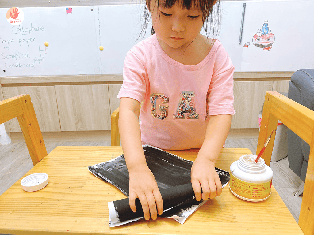 A4紙塗上黑色,等乾之後,讓寶貝練習捲起來,用一支胖一點的筆輔助,寶貝會很有成就感。