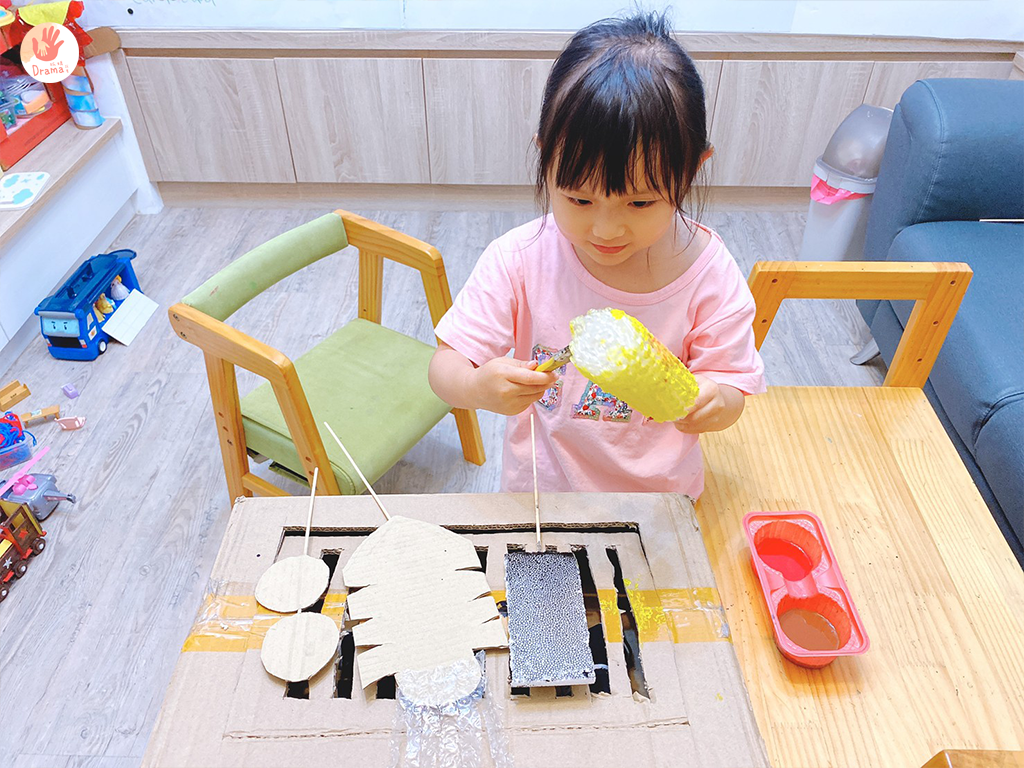 中秋節玩主題親子DIY當然就是烤肉啦!把家裡的紙箱拿出來,做一個高級不彎腰的烤肉架,再拿紙箱裁成甜不辣、透抽,保麗龍超適合拿來做豬血糕,泡泡紙根本就是超美味玉米呀,直接烤起來,老闆我要加辣。讓寶貝練習串 甜不辣 和豬血糕,可以訓練手部的肌力,這些都是有趣的玩中學喲。