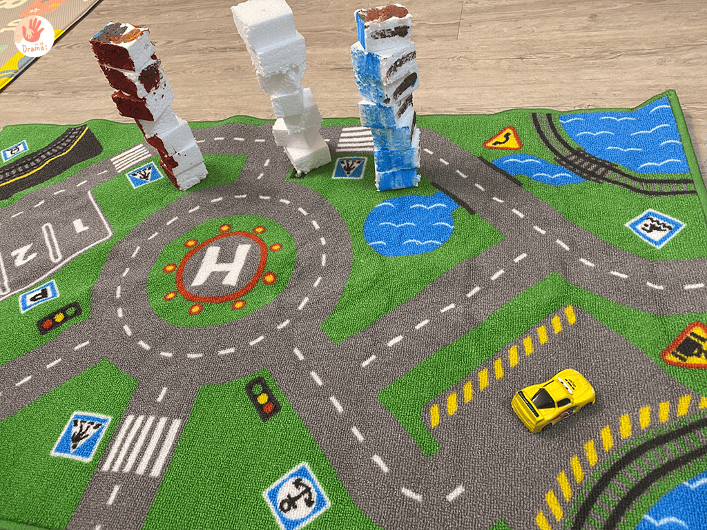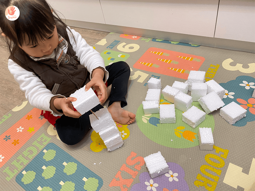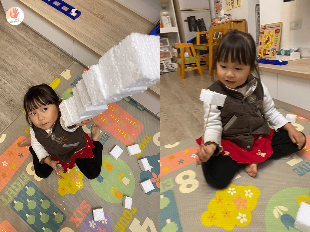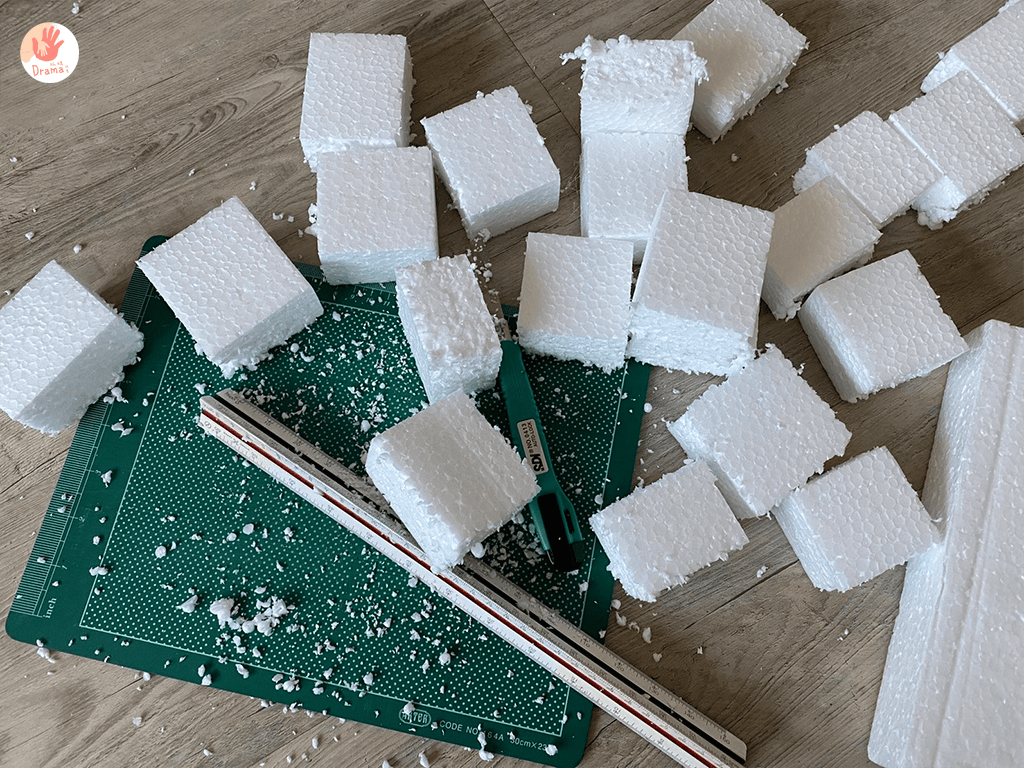 而這次我們用保麗龍蓋房子,可能有人會說保麗龍不環保,其實是因為我們剛入手的除濕機,包裝中的保麗龍,抓媽靈機一動拿來切割成方型,讓寶包可以蓋房子。也可以一起教育寶包什麼材質是可回收和不可回收。