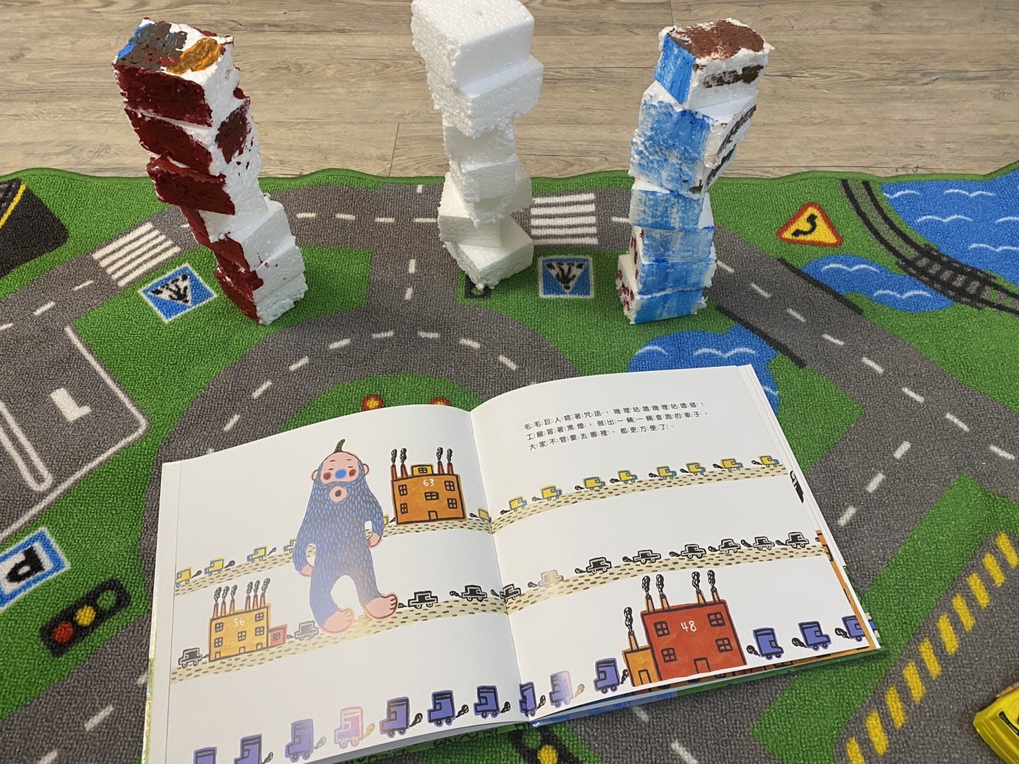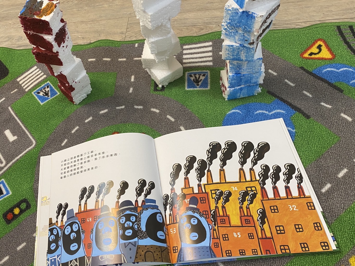 環保繪本:嘰哩咕嚕碰/是描述一位巨人擁有神奇魔法,每當他要施展魔法,咒語就是嘰哩咕嚕碰(這陣子都會和寶包玩起咒語遊戲),村民們請求巨人讓工廠動起來,後來又更貪心的要蓋好多房子好多工廠,結果綠色植物都沒了,每個人也都變得黑黑的,最後只好又請巨人減少工廠,讓綠地重現,這樣才適合人居住。