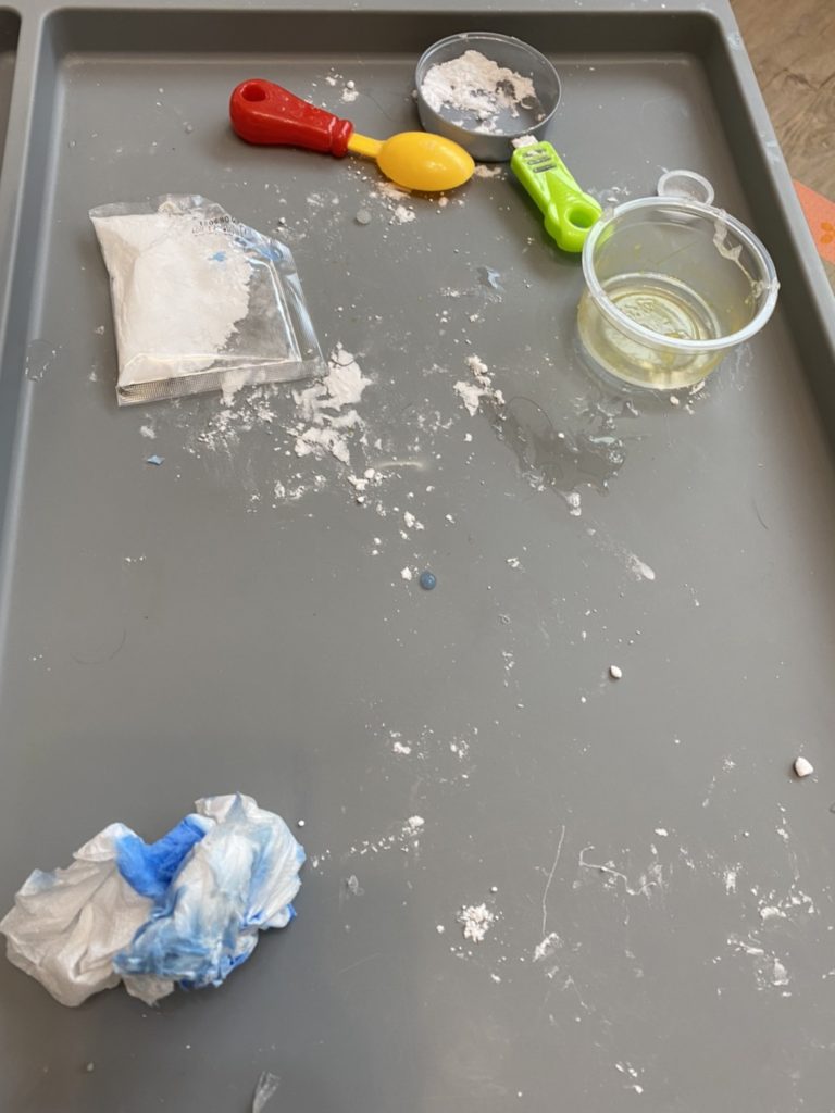 隨便拿起寶包平常在玩的煮菜玩具裝小蘇打粉,和寶包一起玩就是沒在在意亂不亂