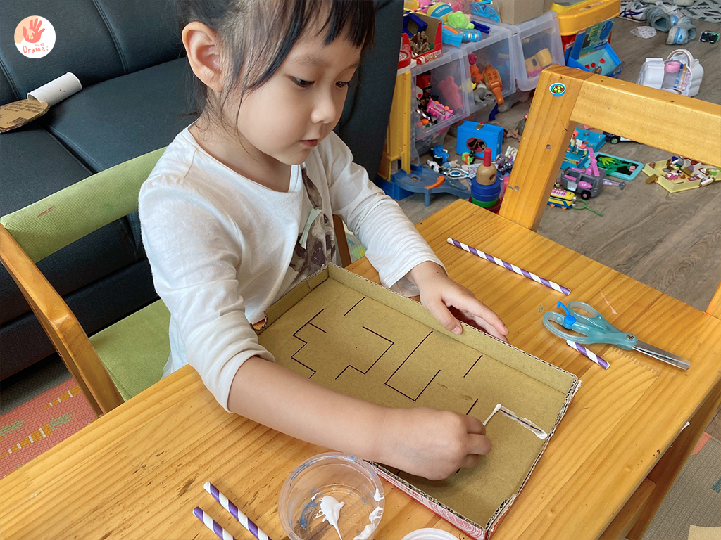 因為我的紙吸管比較硬,所以是由我剪下來由寶貝黏,如果是塑膠吸管就可以交給寶貝來剪
