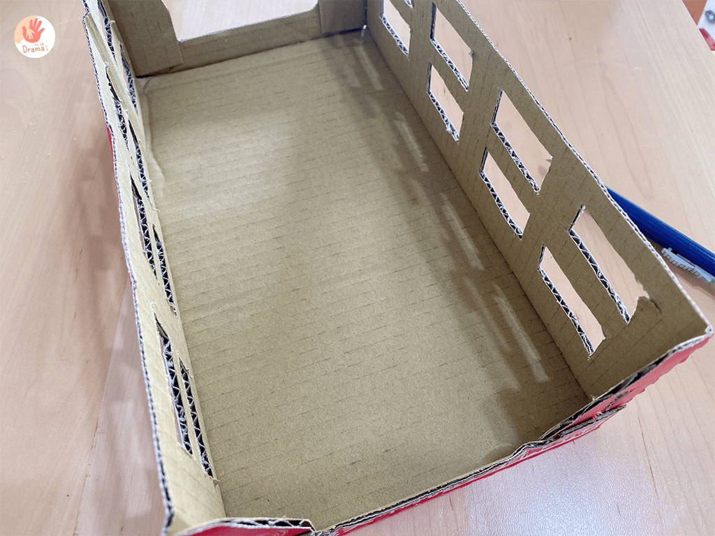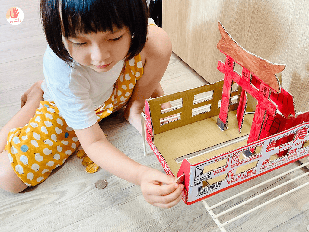 我是用義美125ml保久乳紙箱改造的,很方便尺寸又很剛好,左右切割小窗戶就有五分像了,再搭配其他紙箱剪裁當作廟柱就完成了有趣的籤詩機