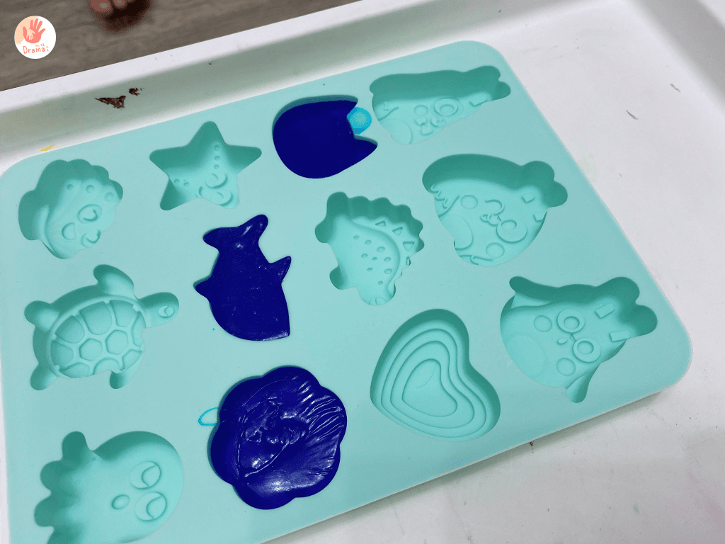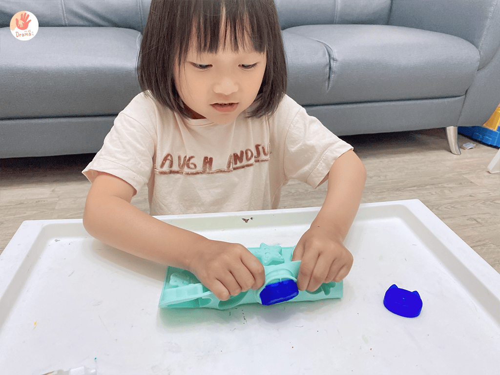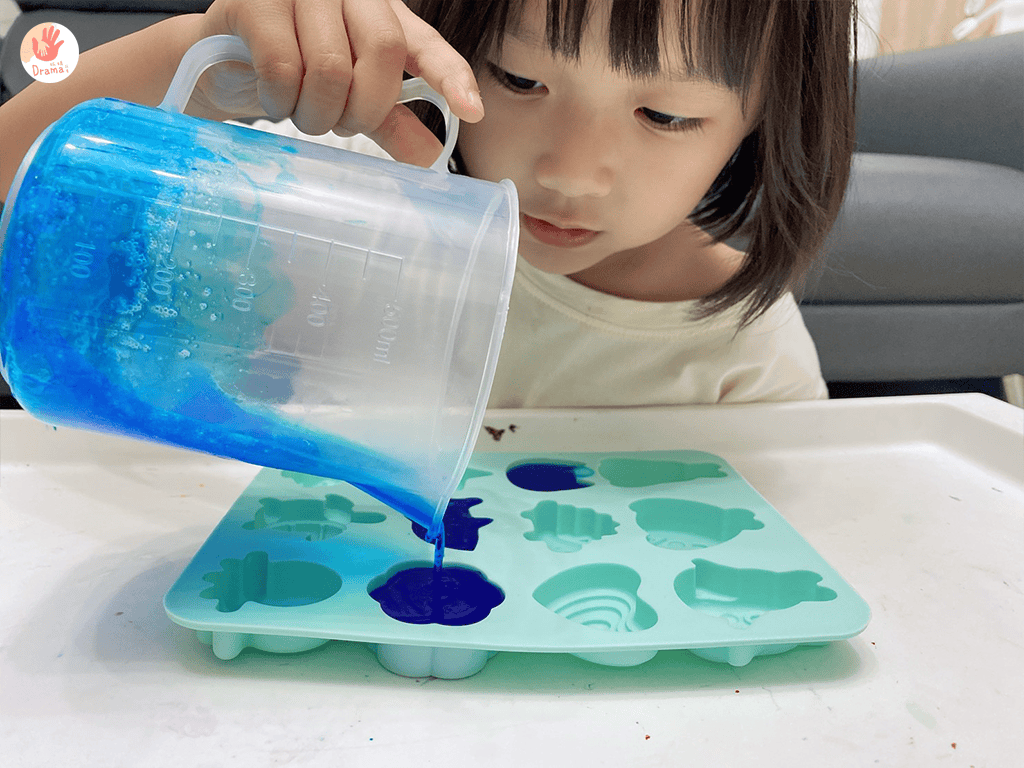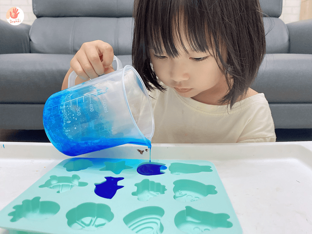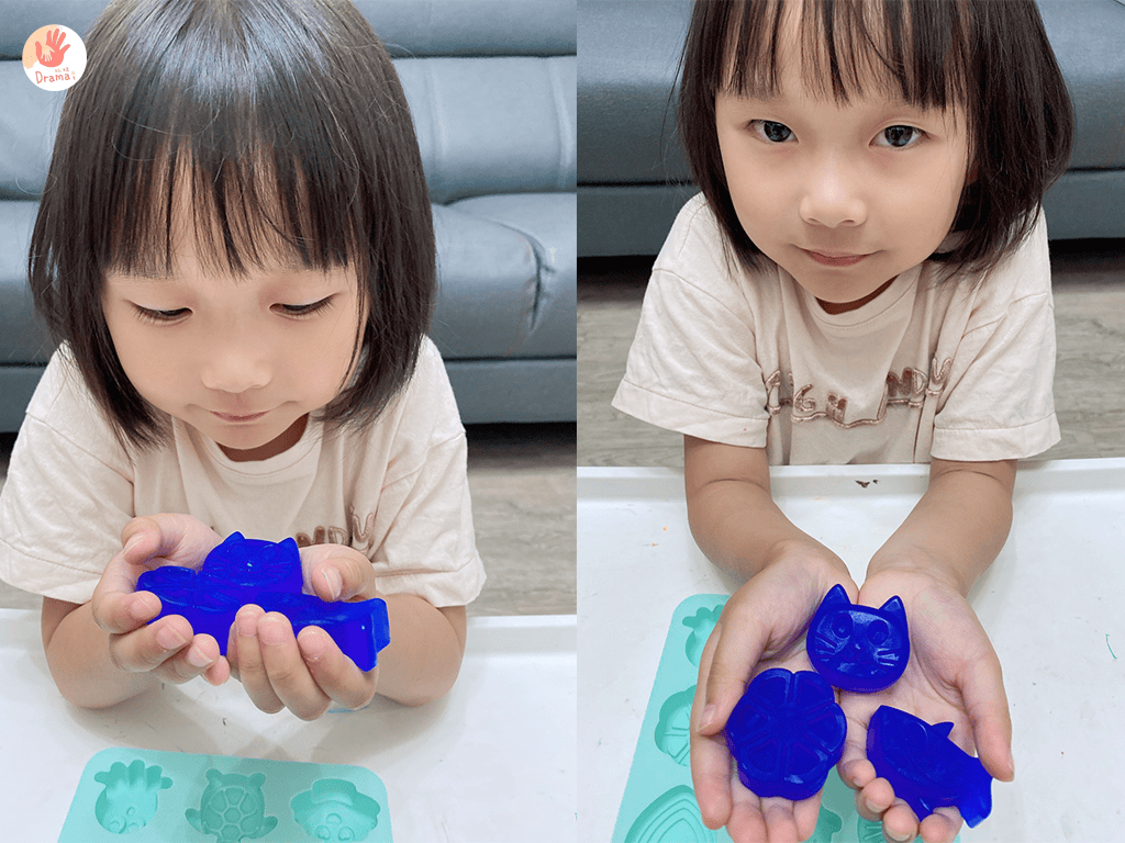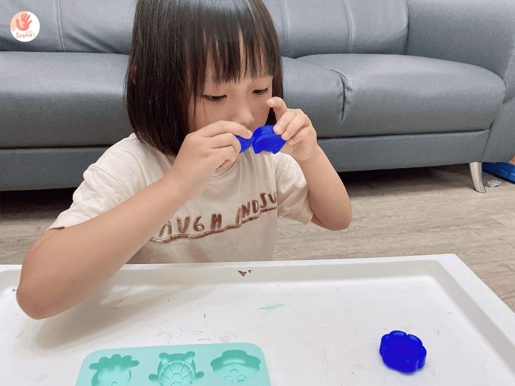 我是拿出來給女鵝加色素攪拌再倒入造型模中,但香皂其實乾的很快,所以動作都要很迅速,女鵝後來自己看說明書說,色素是要在隔水加熱時加入,媽媽還被指正,但因為我想要讓她有參與到加色素,所以怕燙傷所以拿到客廳(媽媽可是用心良苦呀)