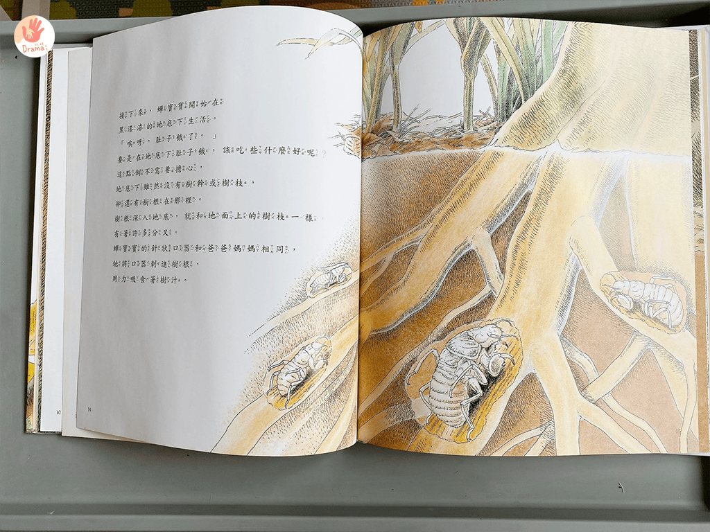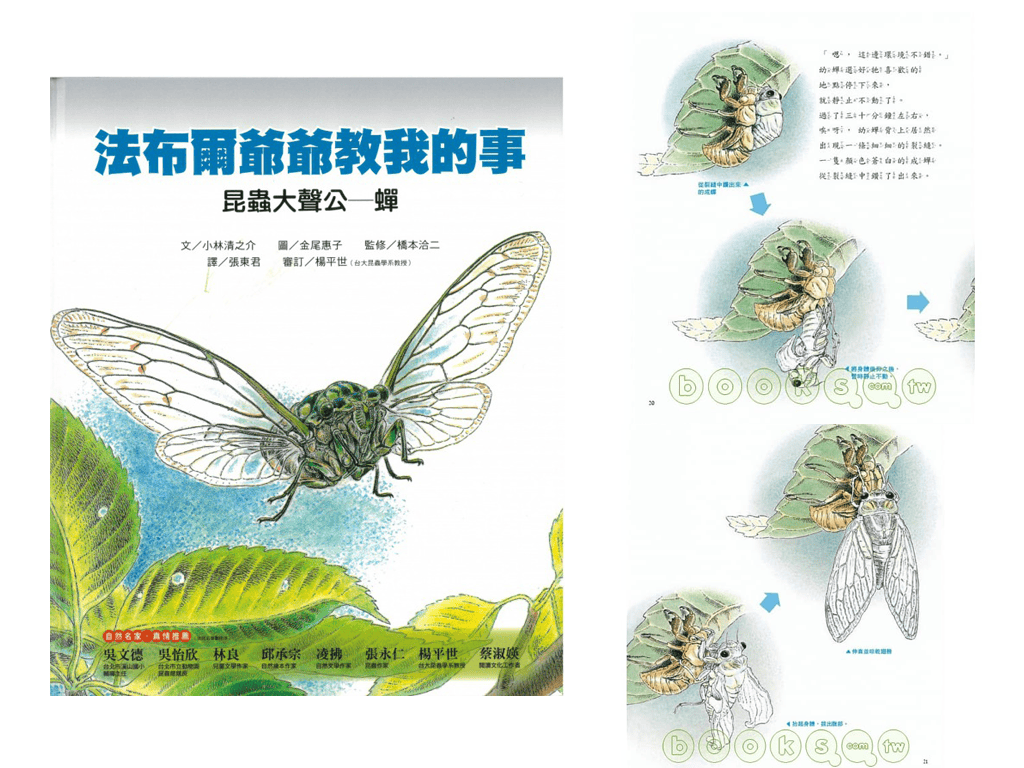 如果孩子沒看到蟬的長相,可以入手這本法布爾爺爺教我的事|昆蟲大聲公—蟬,法布爾是一位法國的昆蟲學家也是一位科普作家,由〈法布爾昆蟲記〉改編的兒童自然昆蟲繪本,裡面的插畫是由日本知名自然生態插畫家,呈現接近昆蟲真實的圖畫,深入淺出從圖畫間讓孩子認識昆蟲