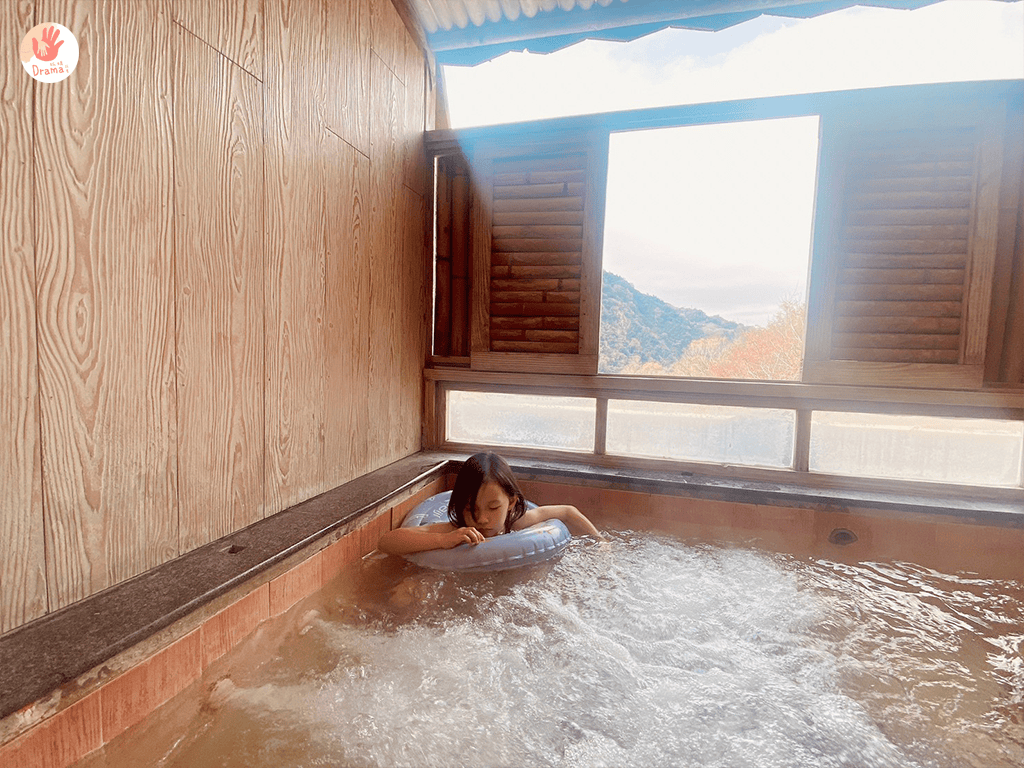 這裡的池還蠻大也蠻深的,雖然女鵝站起來是剛好在肩膀的位置,但坐下來就會到頭,所以我們隨時泡湯都會準備小泳圈,讓她可以更自在