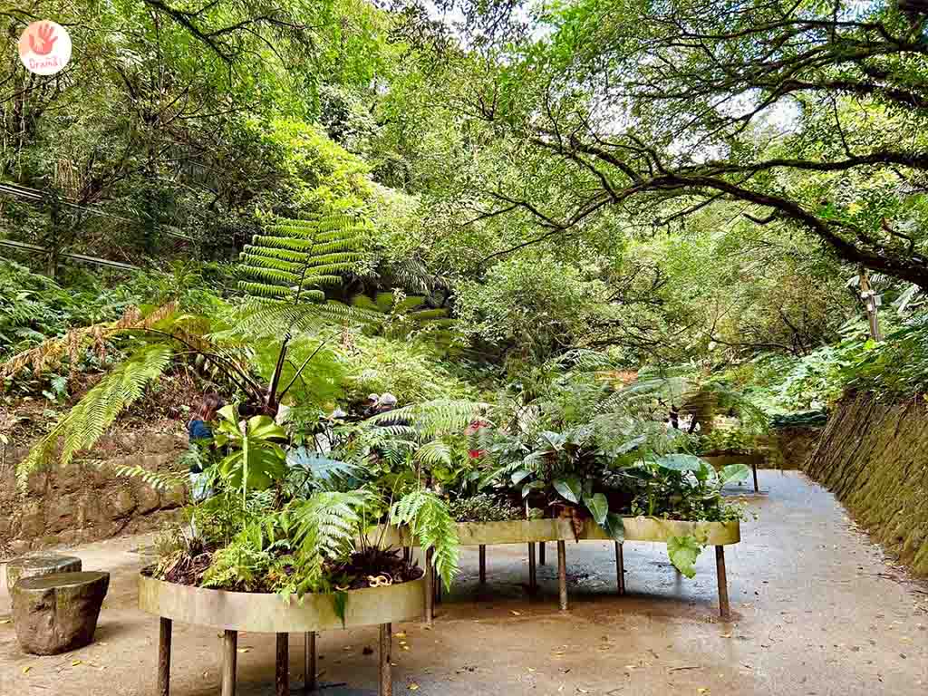[劉銘傳隧道]前的壁岩結合了綠植意象在兩側,有種前往叢林秘密基地的感覺,森林系感的隧道女兒也興奮的想前往探險了