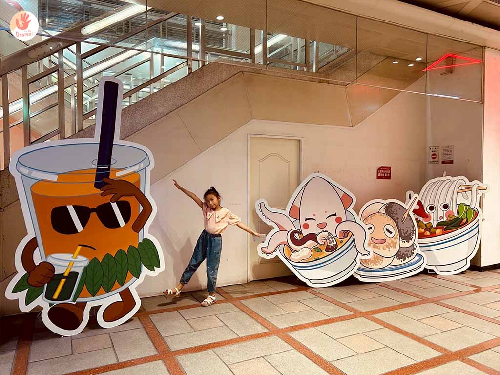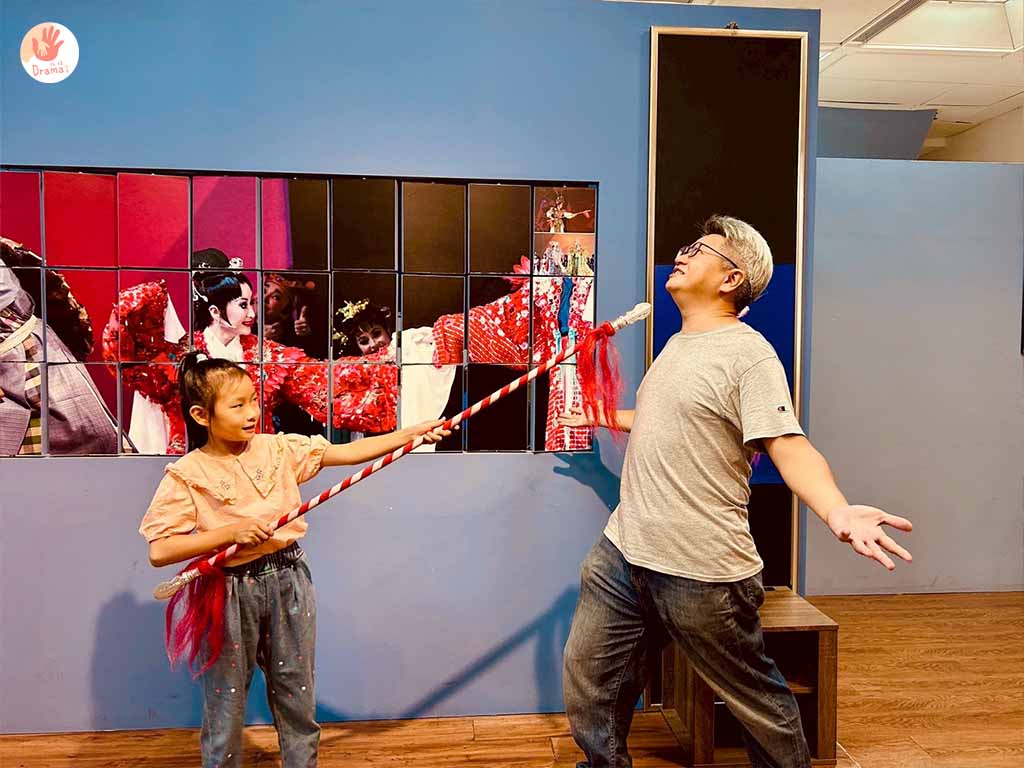 女鵝很入戲的和抓爸演起來歌仔戲,在店員的指導下,抓妹還頗有架勢的