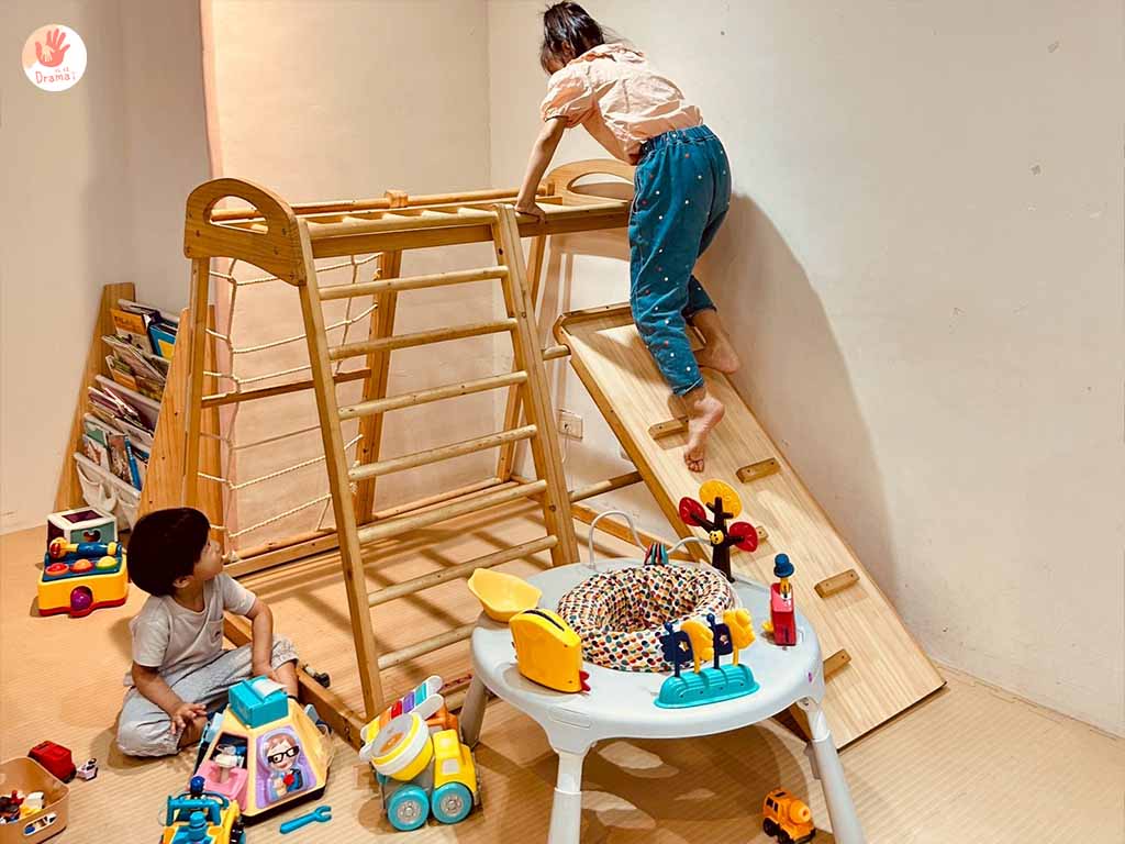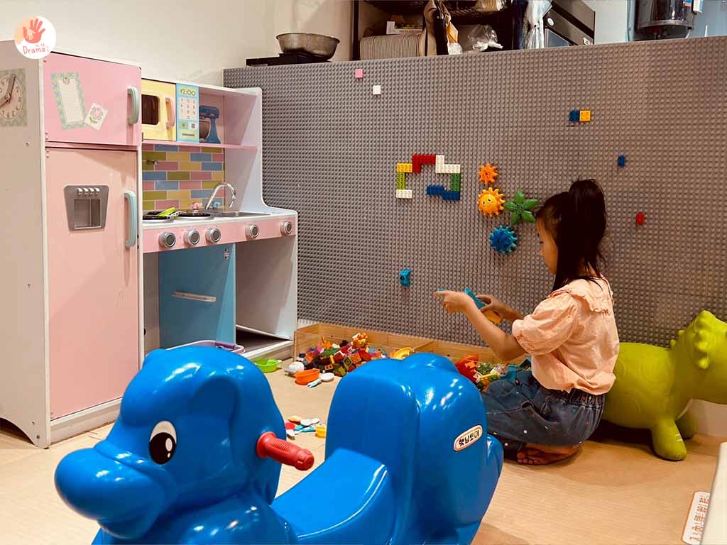 [遊霂食光]遊戲區必須說空間不大,但設施玩具幾乎什麼都有,像是家家酒、積木、小型攀爬區、童書繪本、益智玩具、搖搖馬…..非常夠玩