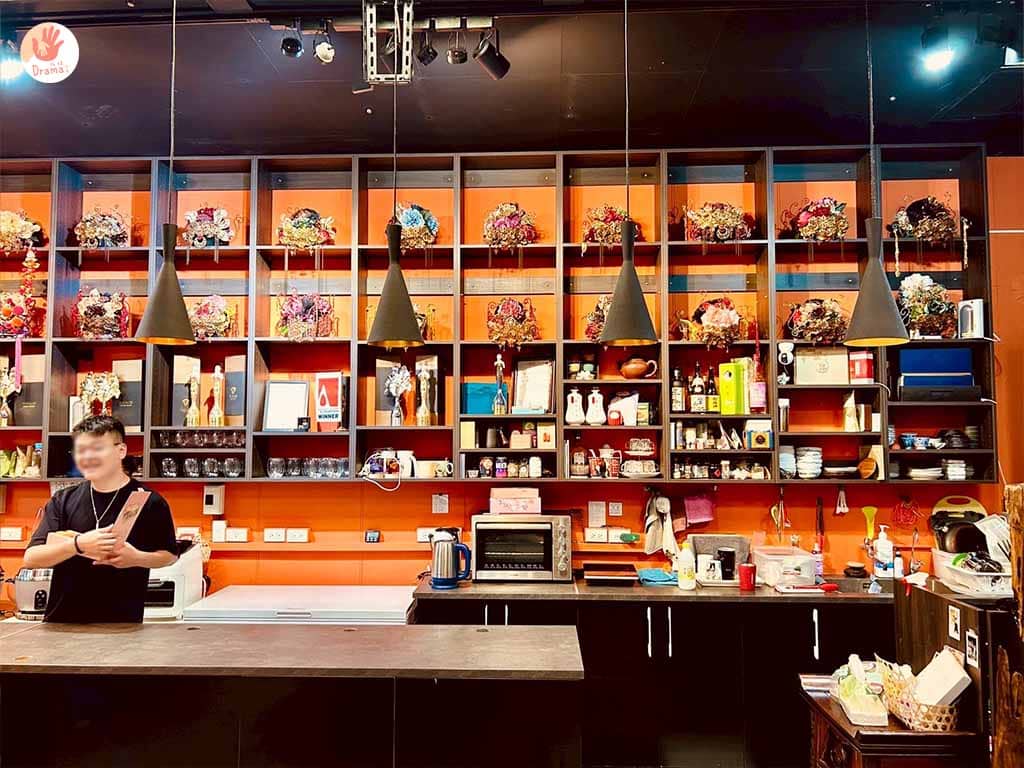 [戲棚]的吧台後方牆面上都是古裝劇的頭飾,來訪也別忘了可以欣賞一下
