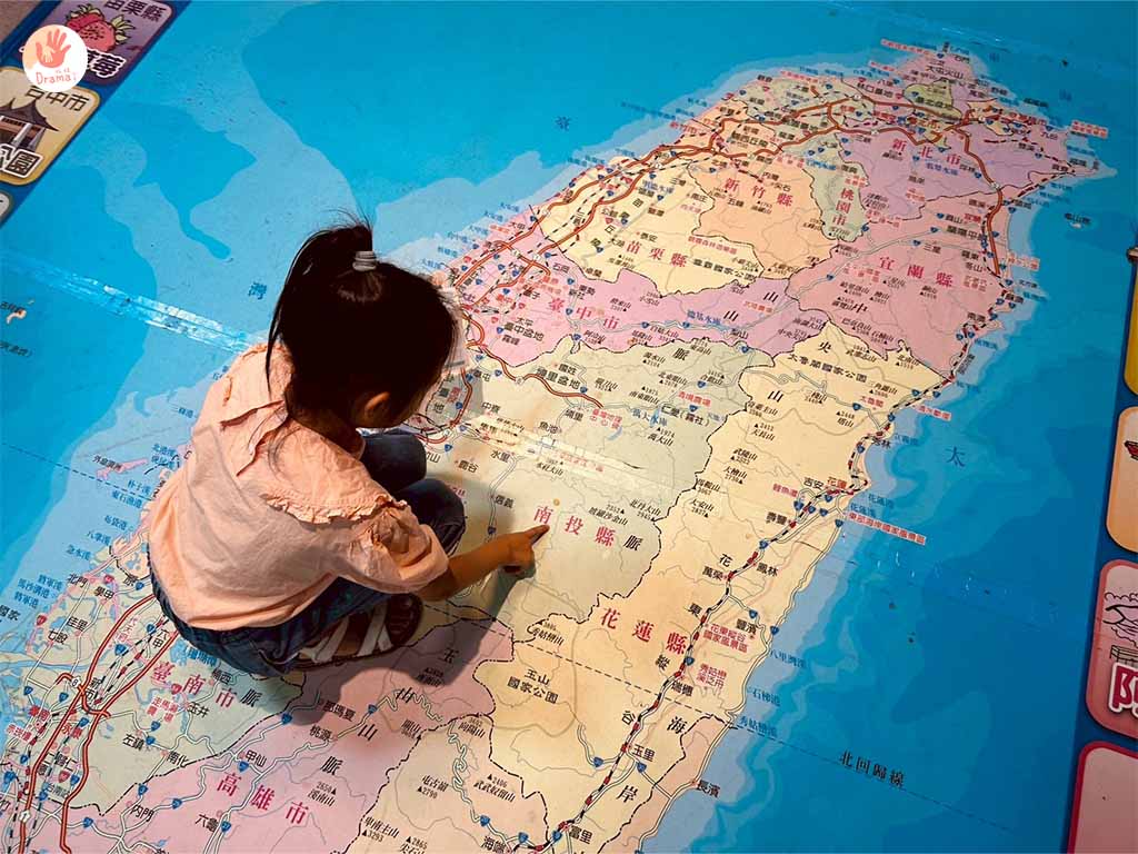我們在[慢旅地圖空間]抽到的題目是台灣最大的天然湖泊是在哪裡?這題抓爸秒答,答案就是日月潭,我們也帶孩子一起找找南投縣在哪裡