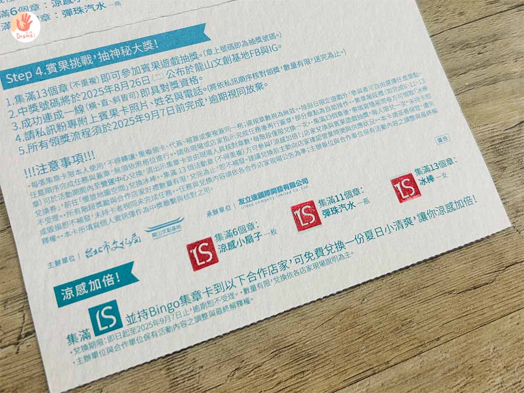 [冰BINGO~龍山集章,清涼一夏!]集滿集滿6個章:涼感小扇子一枚|集滿11個章:彈珠汽水一瓶|集滿13個章:冰棒一支(需填寫簡易問卷)