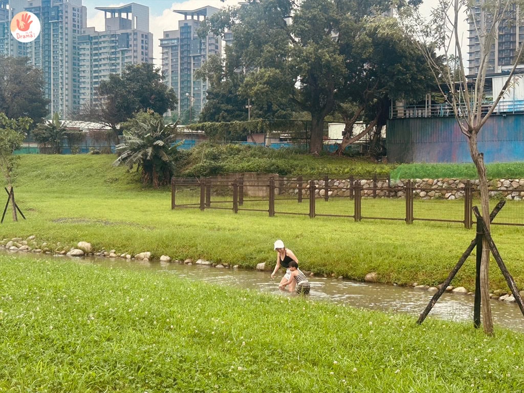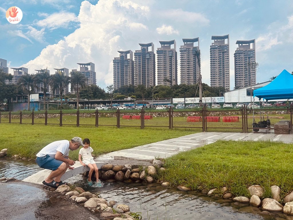 人工溪流目前開放最上游第一區的親水區域,親水時請家長務必陪同小朋友一同遊玩,並注意自身石頭滑度安全。來訪時抓爸說下游的區塊石頭上都很多泥叫我們不要下水,回來查了官方新聞稿,才看到新聞稿寫第一區可戲水,其它區河段為景觀河段不建議進入水域