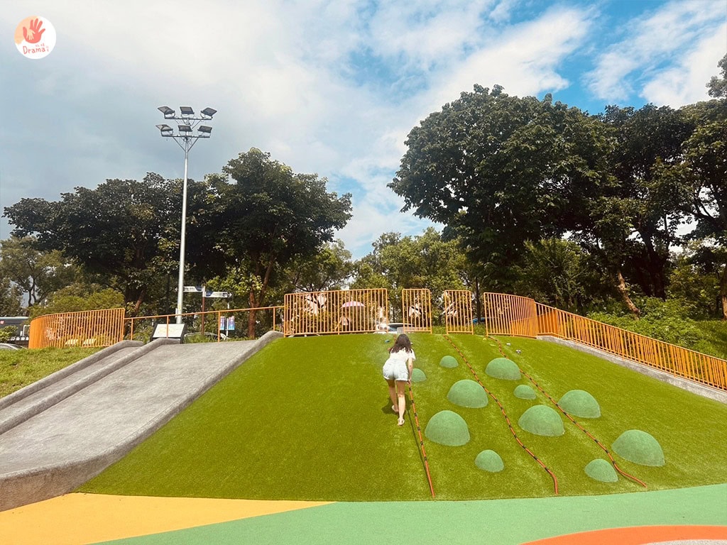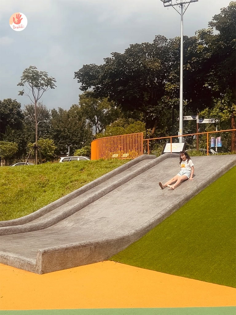 小山丘攀爬也很適合幼童,抓媽還保有童心動一動,雨後的磨石子溜滑梯速度好快呀~~~哈