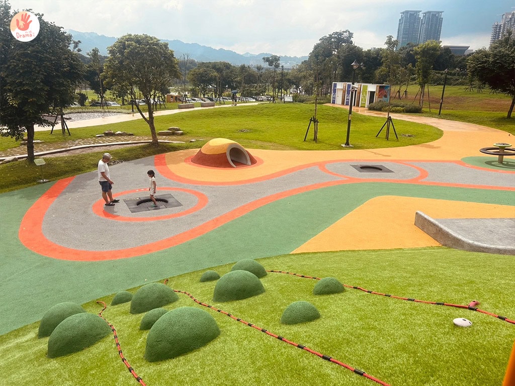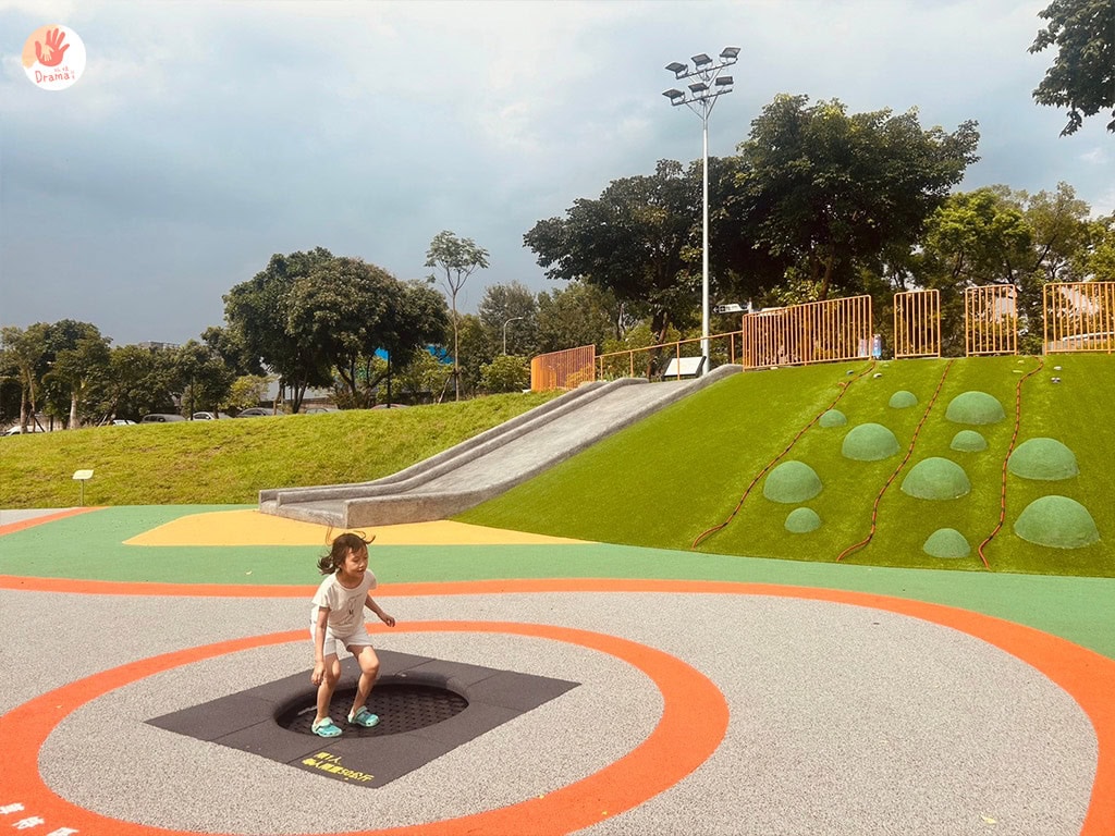 以水管洞穴和小山丘攀爬的繽紛設計,沙池。鳥巢鞦韆。平衡木。磨石子溜滑梯,還有大人小孩都愛的跳床