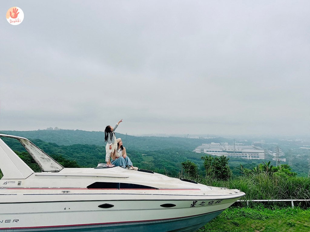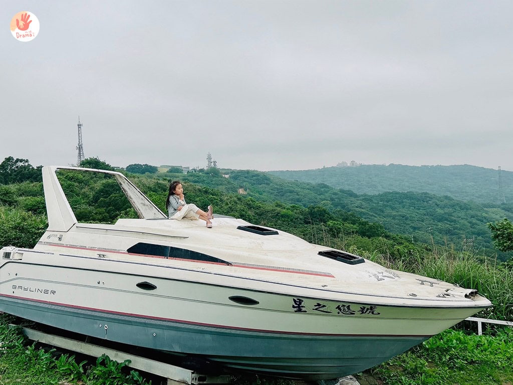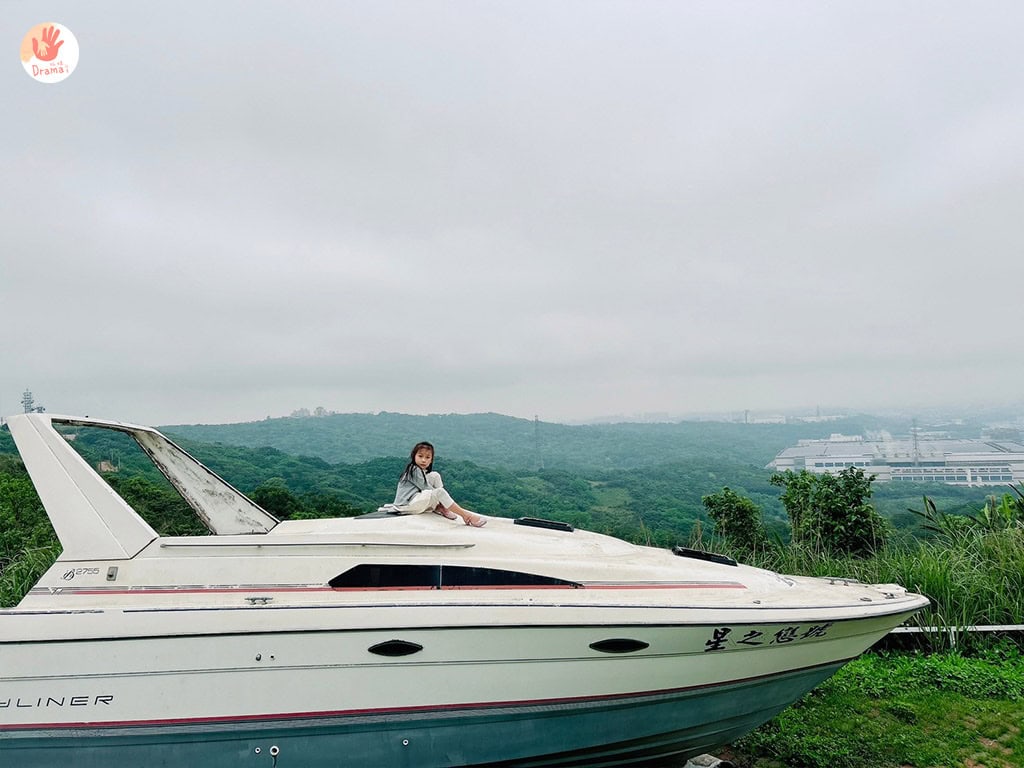 [星之戀景觀咖啡]這裡戶外區放了一艘已經廢棄的小遊艇,坐在遊艇上和天空綠意山間合影真的超美,當天來訪雖然天空灰灰的,但也有一種幽靜美