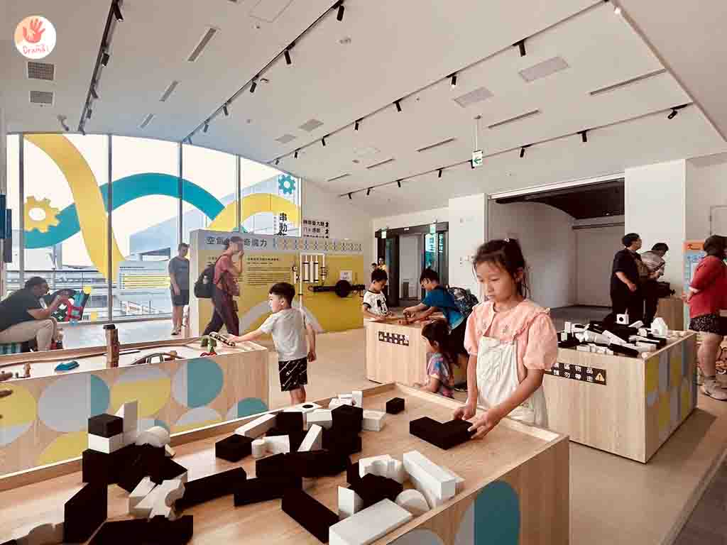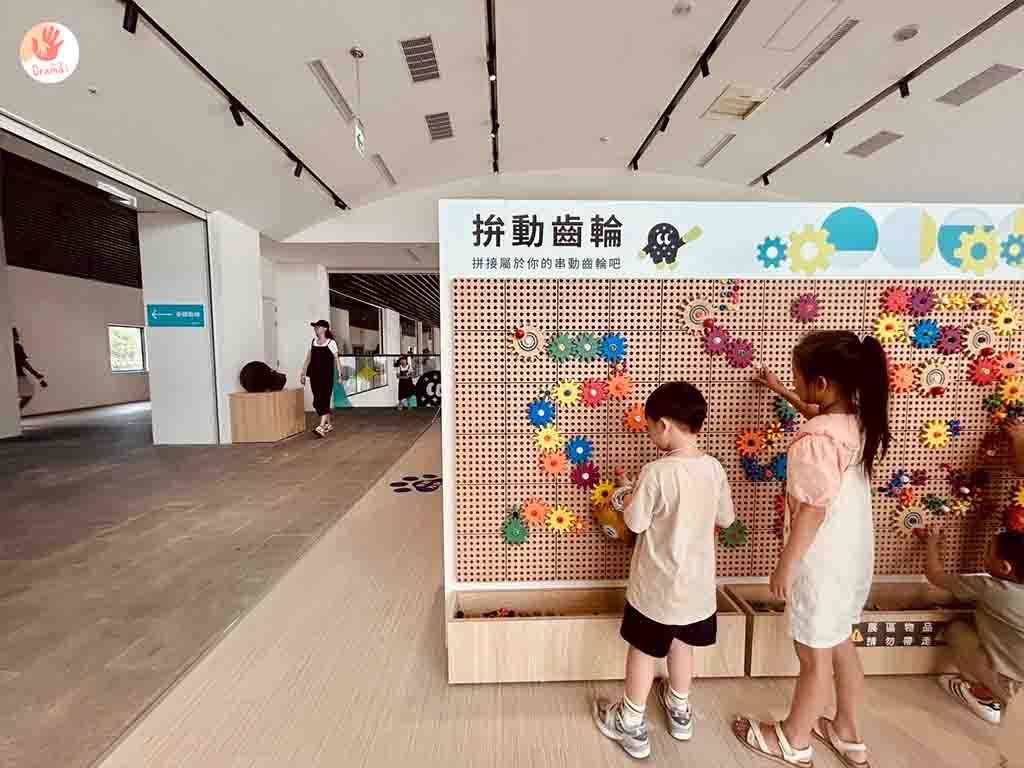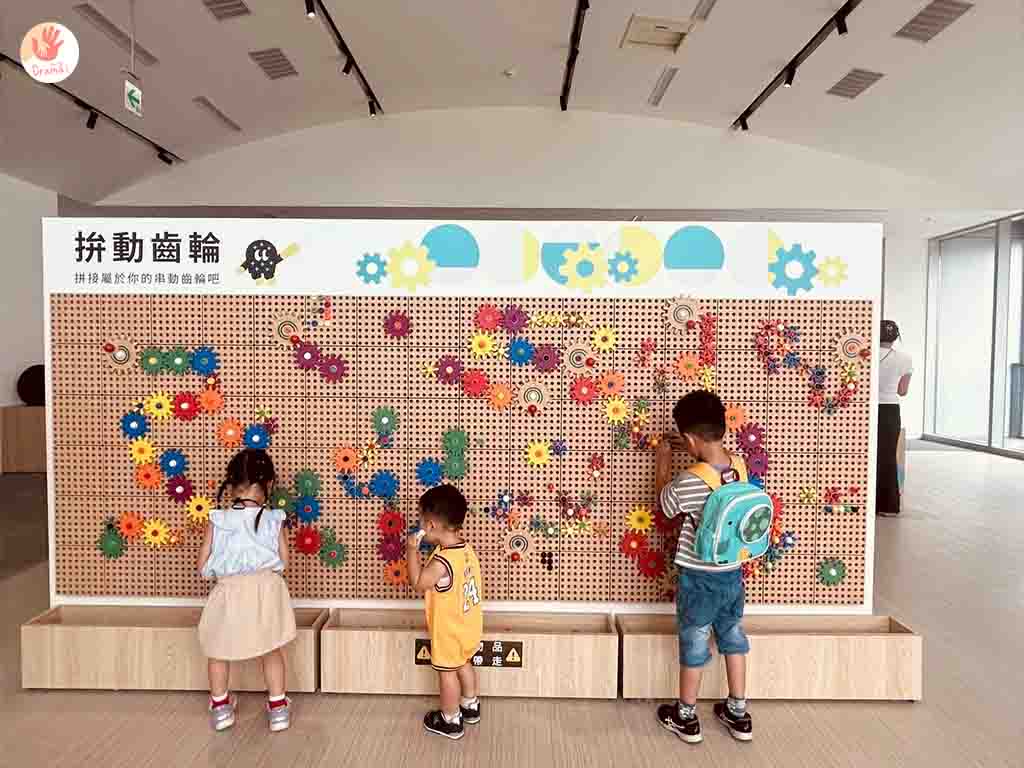 [苗栗火車頭園區]還貼心的規劃了兒童遊戲區,結合火車齒輪主題小孩可以在拼接牆上玩上好一會