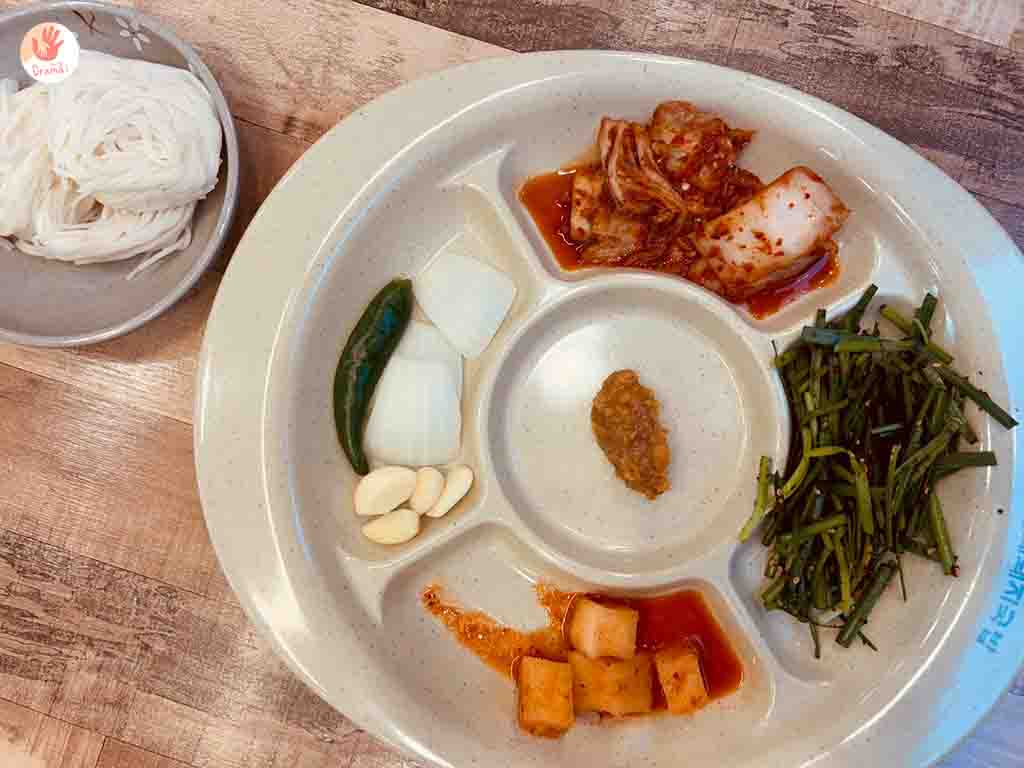 有蝦醬、泡菜、大醬、韭菜、蘿蔔、蒜頭可以搭配,還有一球小麵線