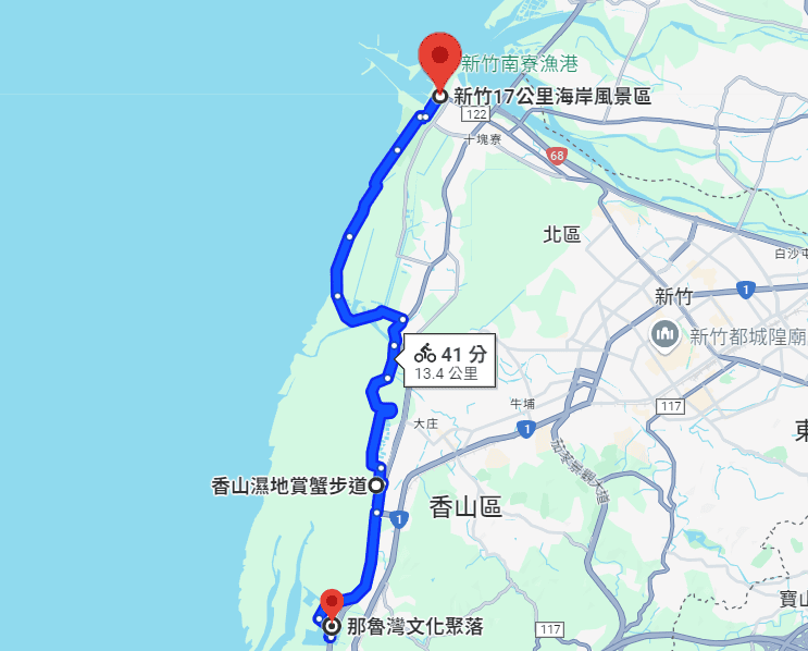 [那魯灣文化聚落]距離[香山濕地]比較近,如果要再騎到[南寮漁港]不停留的話要騎41分鐘。