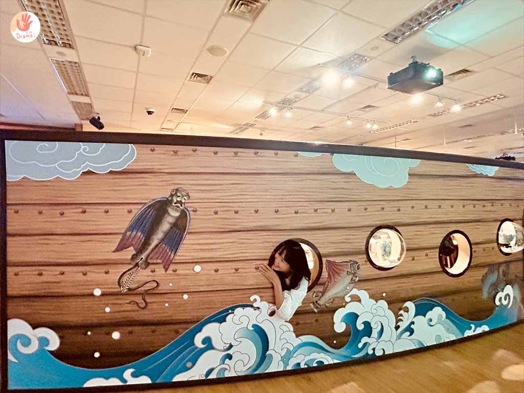 [兒童學藝中心]中間有一艘大船,中間有一些兒童圖書,也有桌椅可以一起親子共讀,另外也有益智的小玩具