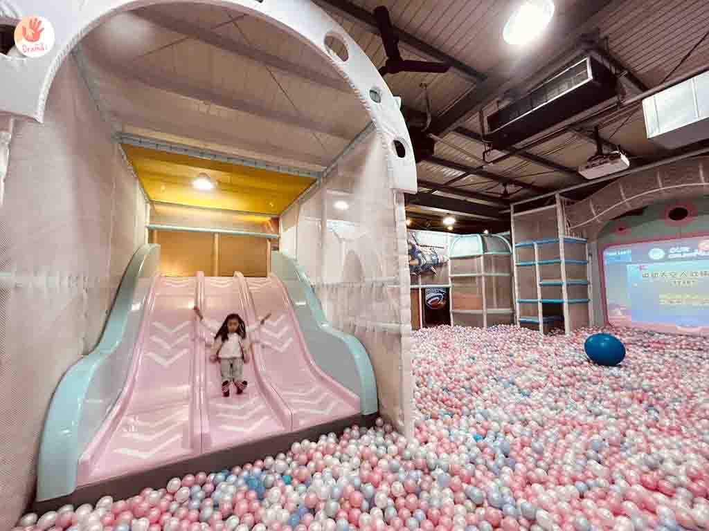 [咱們小時候-親子餐廳]夢幻球池溜滑梯,不是高速也很適合小幼童來玩,一旁還有攀岩設計,女鵝長大了也勇敢挑戰