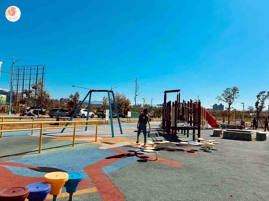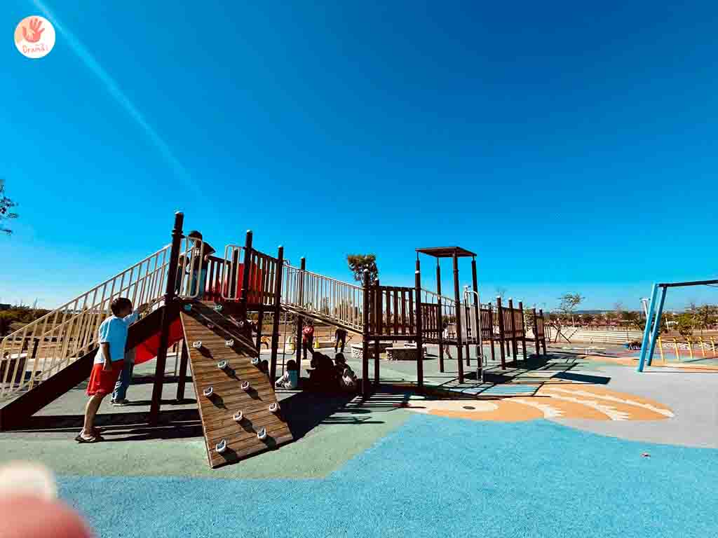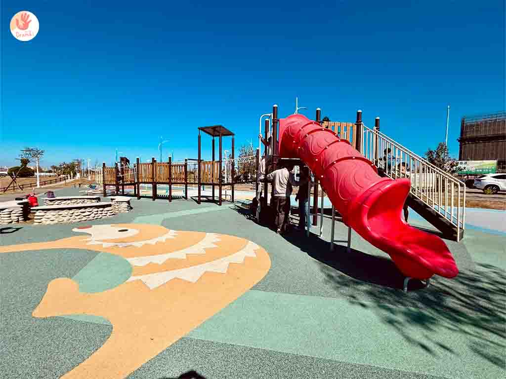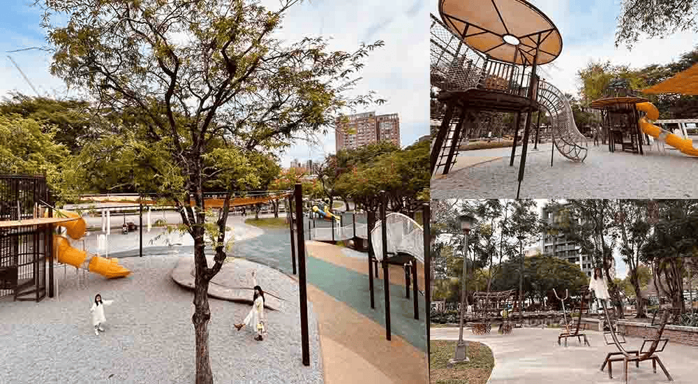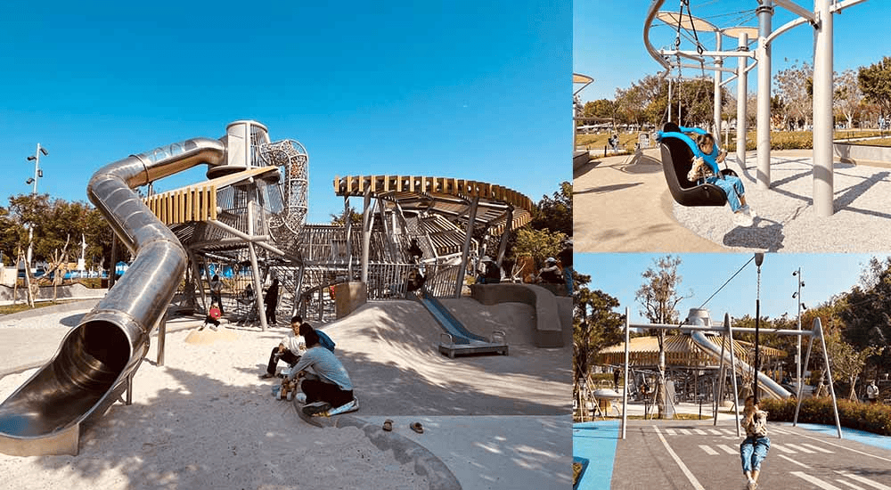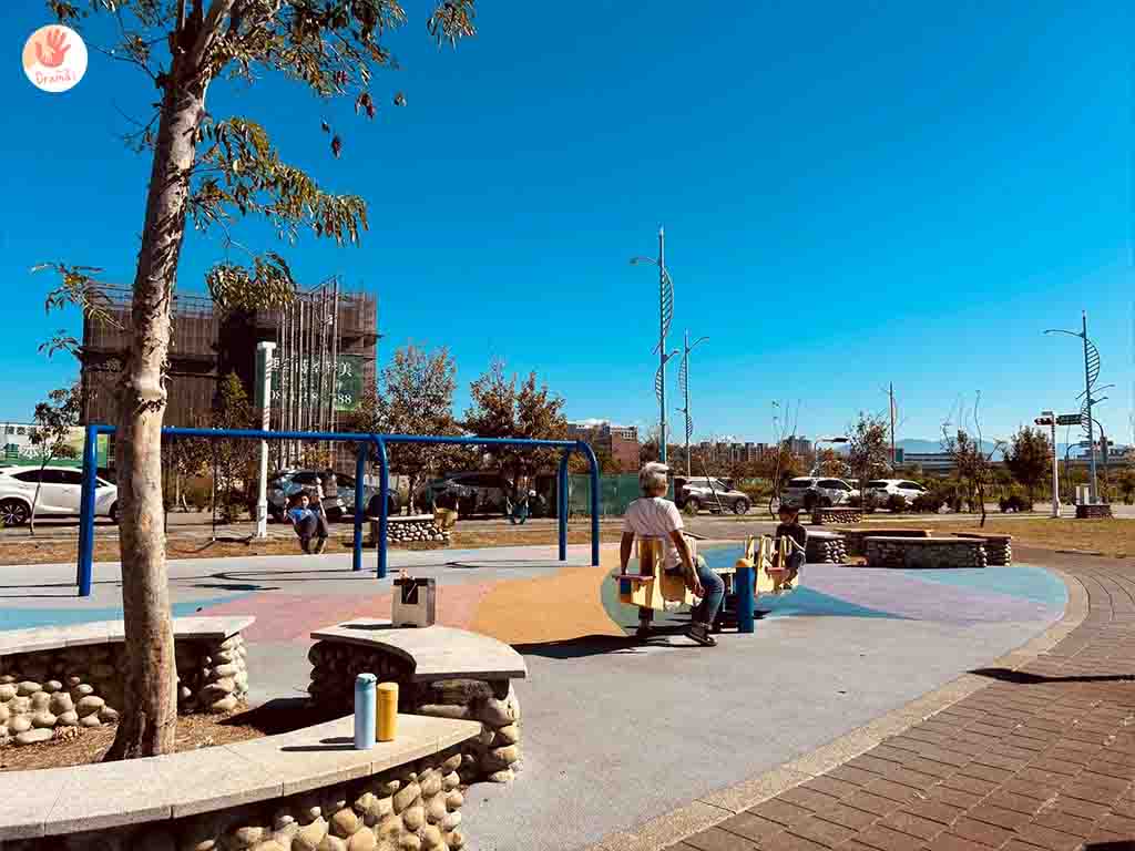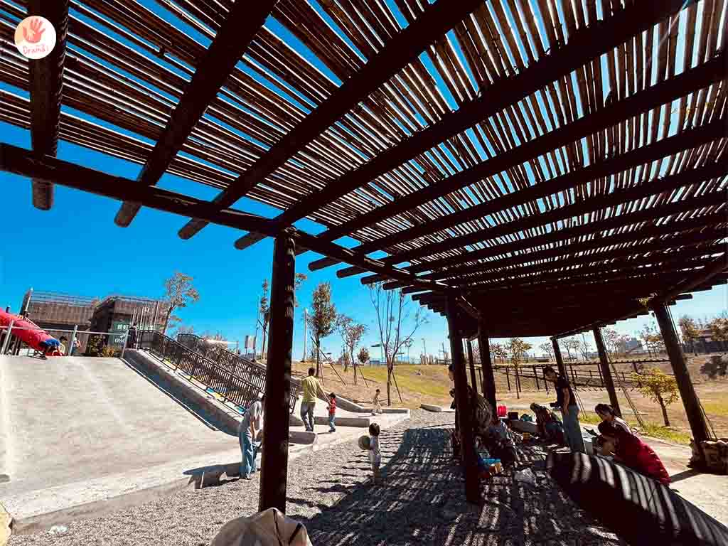 [樂田公園]近期在沙池期新完工增加了遮棚設計,讓夏天玩耍家長小孩都能有休憩不怕曬的安排,建議可以搭配鄰近的景觀餐廳,一日遊更充實!