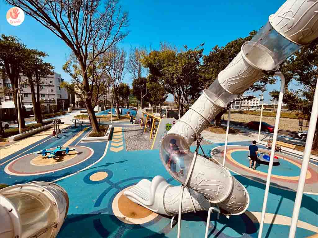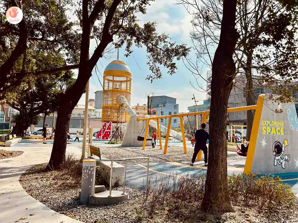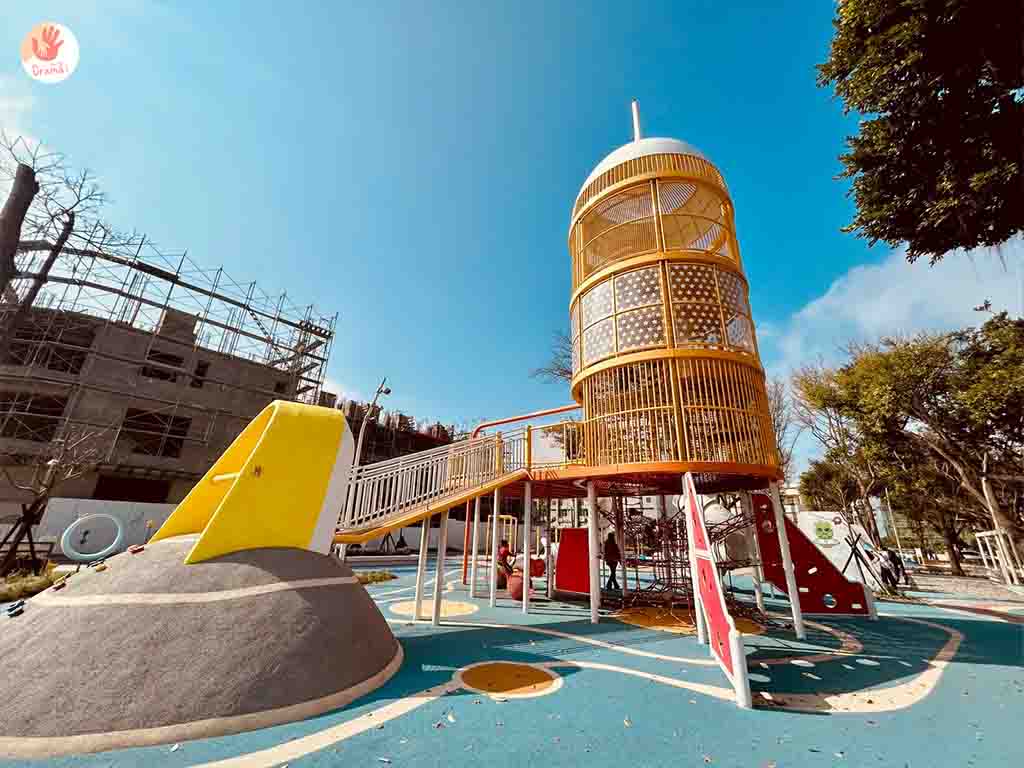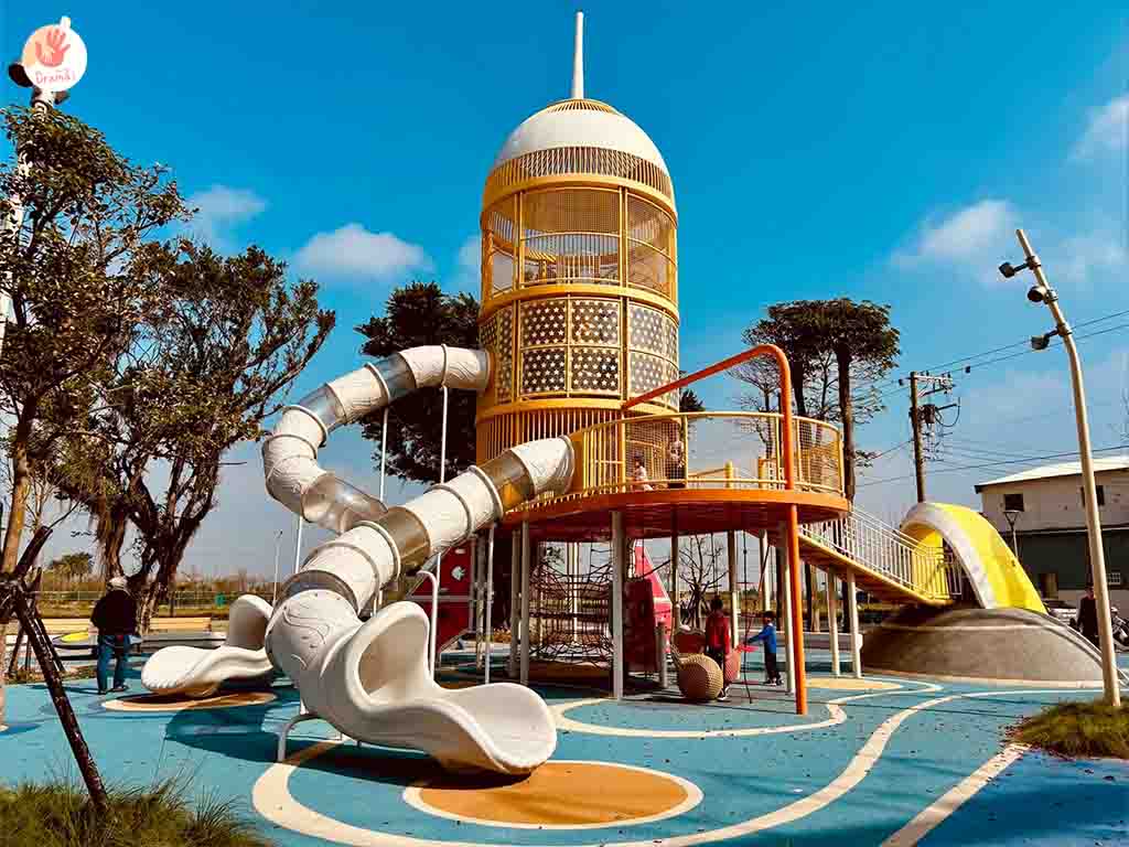 彰化二林以太空科技為主題,打造[星球探索樂園]~14米高探險飛梭遊戲塔,結合登艙棧橋、月球遊戲丘、飛天鞦韆、太空跳躍及旋轉飛盤等多元遊具。