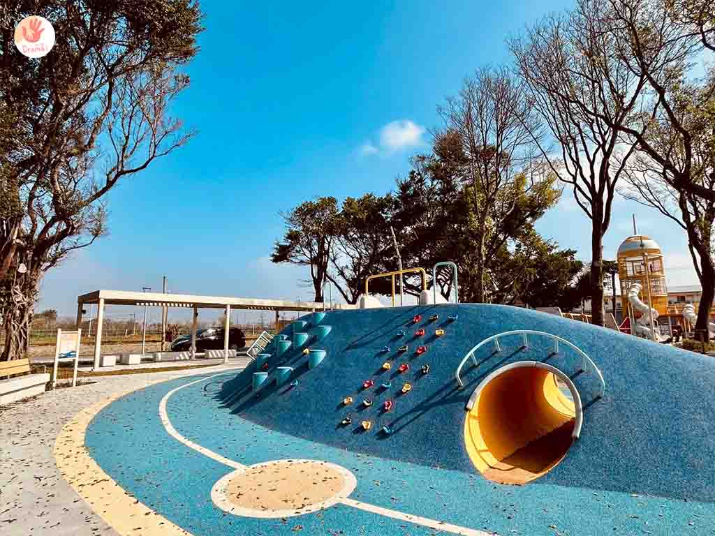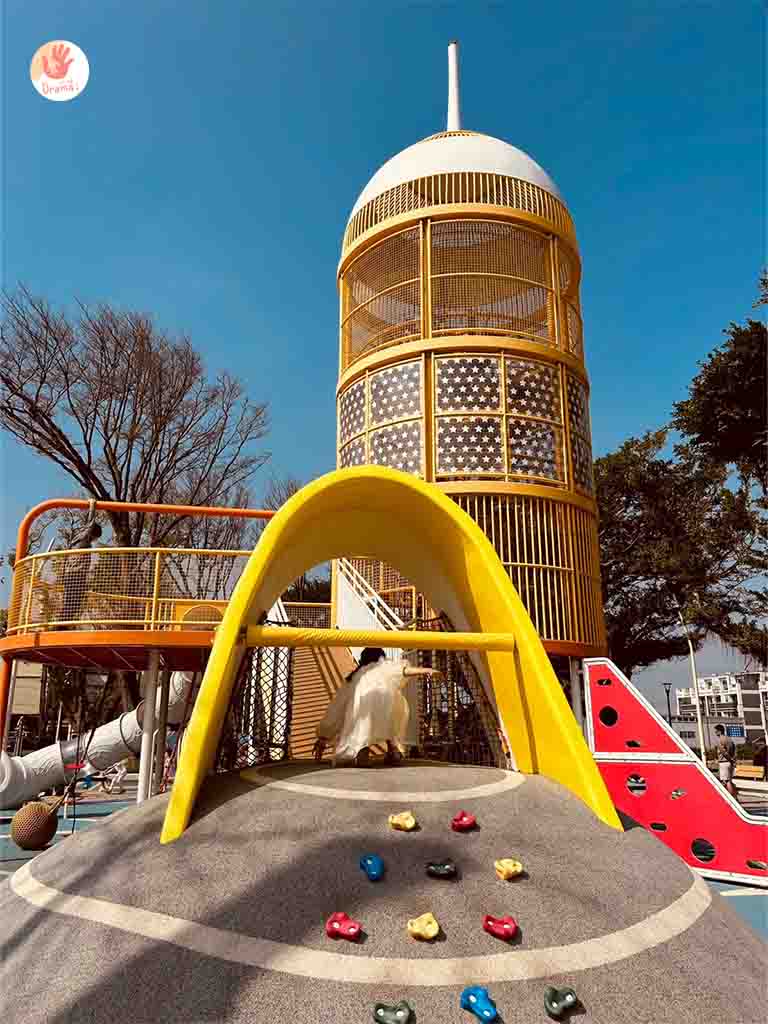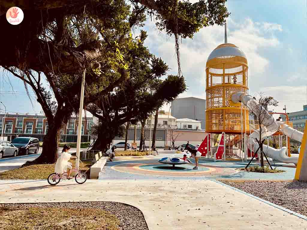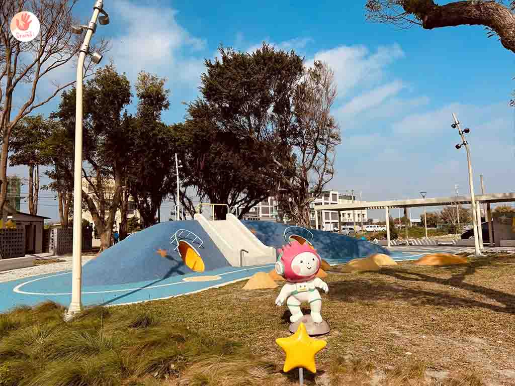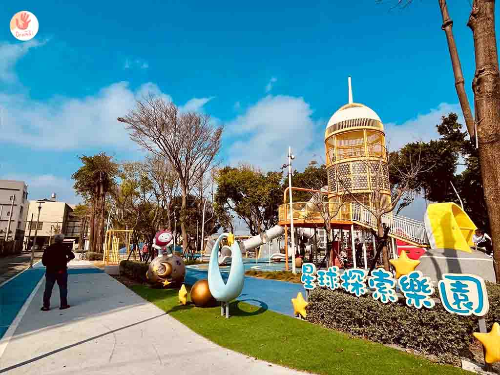 [星球探索樂園]全齡共融遊戲場,打造太空主題遊樂設施,也設有廁所,公園也設計了藍色腳踏車道,我們家抓妹騎了好幾圈