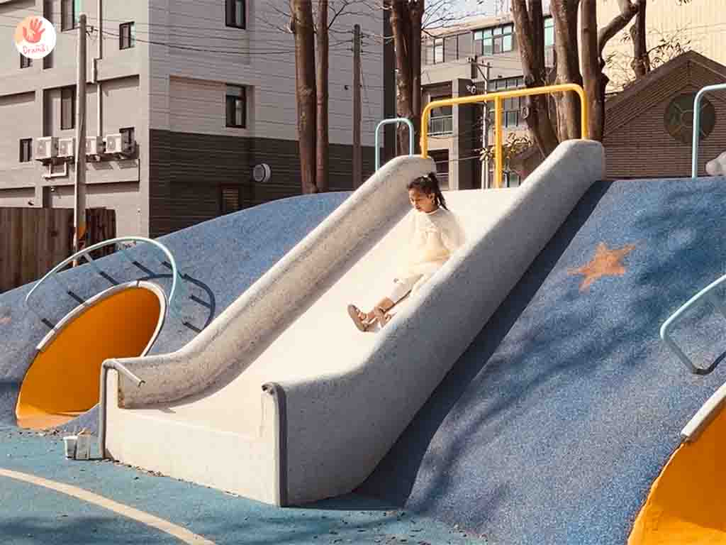 [星球探索樂園]還有適合小幼童攀爬的月球探險山丘,磨石子溜滑道速度蠻快的,小幼童家長要留意在下方隨時支援以免小小童失速