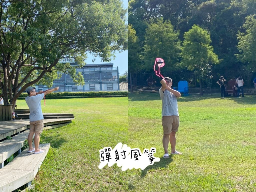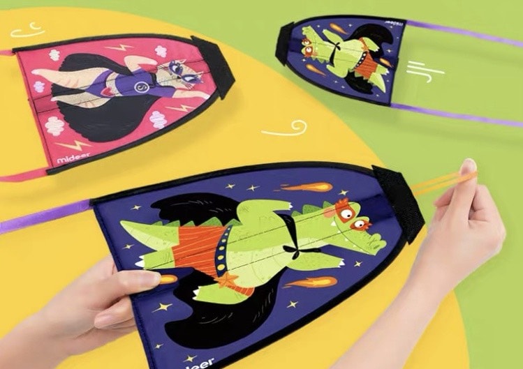 這款玩具是利用橡皮筋的拉力彈飛風箏,比較適合大小孩和大人玩給小孩看的玩具,然後小小孩負責撿,分工合作草地才更有樂趣