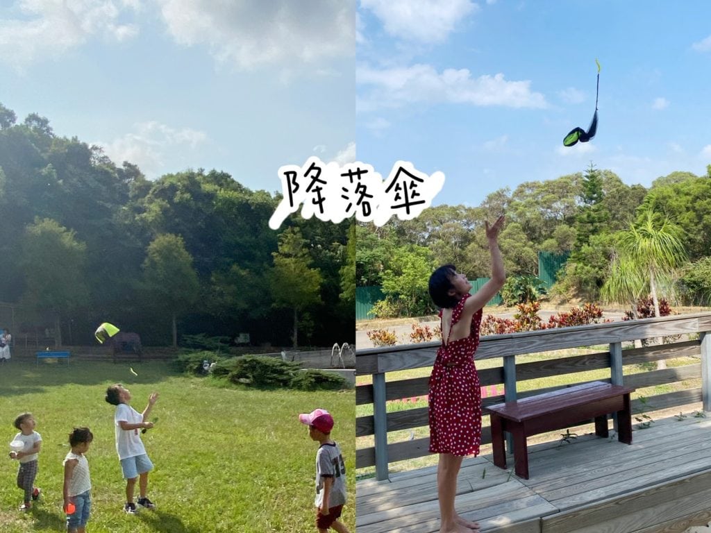 降落傘是讓孩子們試著用手臂的力量拋向空中,從高處降落再撿起來,保證累人