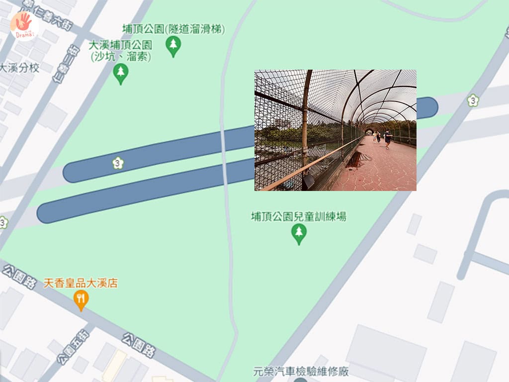 [大溪埔頂公園]位在大溪區仁善街與埔仁路交叉口,若想要近[滾輪溜滑梯遊戲場]就可以Google map搜[埔頂公園(隧道溜滑梯)],這裡有少量停車位,但若停滿,可以在仁善二街和仁善三街這裡有停車場(導航點這裡),步行2分鐘就抵達[埔頂公園(隧道溜滑梯)]