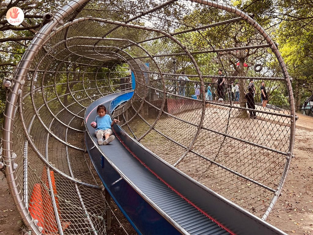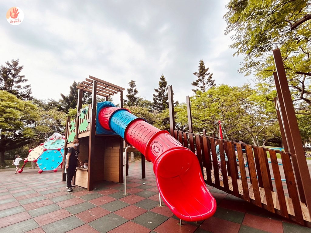 幾何攀爬網和森林小屋溜滑梯,這裡還有360度轉塔,小孩在這裡有各式小肌肉的訓練