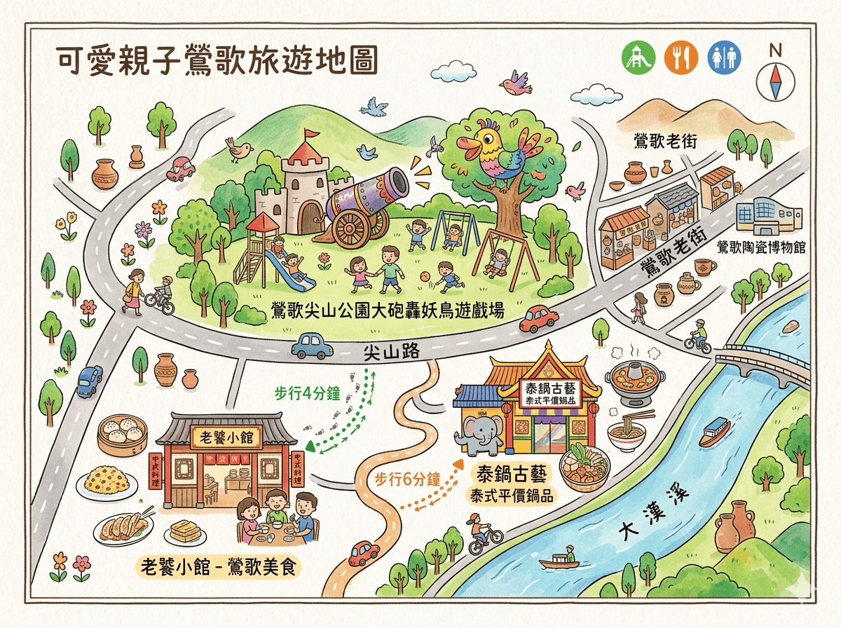[尖山公園]距離鶯歌老街車程只要4分鐘,[尖山公園]週邊有二間人氣美食餐廳,我們原定要吃[老饕小館]結果沒有訂位,假日竟完全客滿,後來改去[泰鍋古藝]也是超人氣,我們入座後就立馬客滿,還好來得早,結帳後門外都在排隊等候。