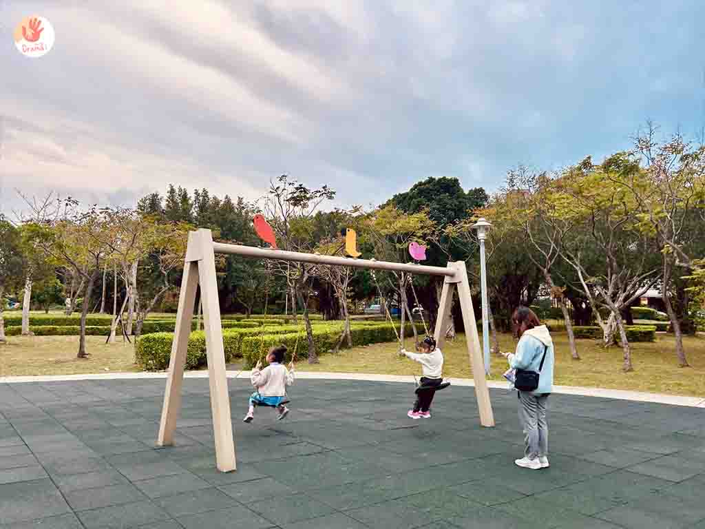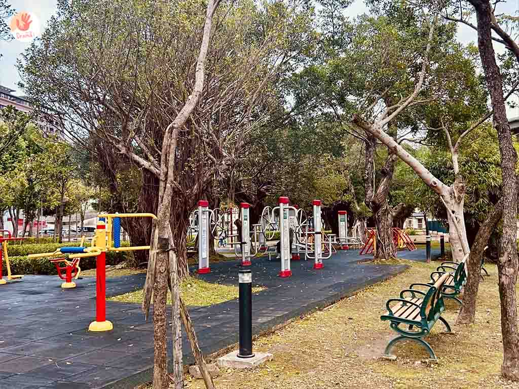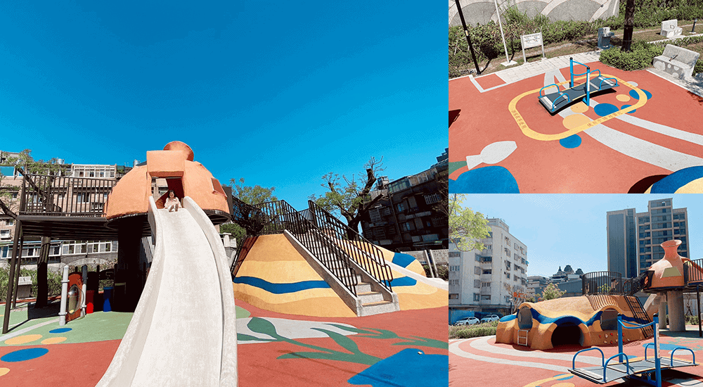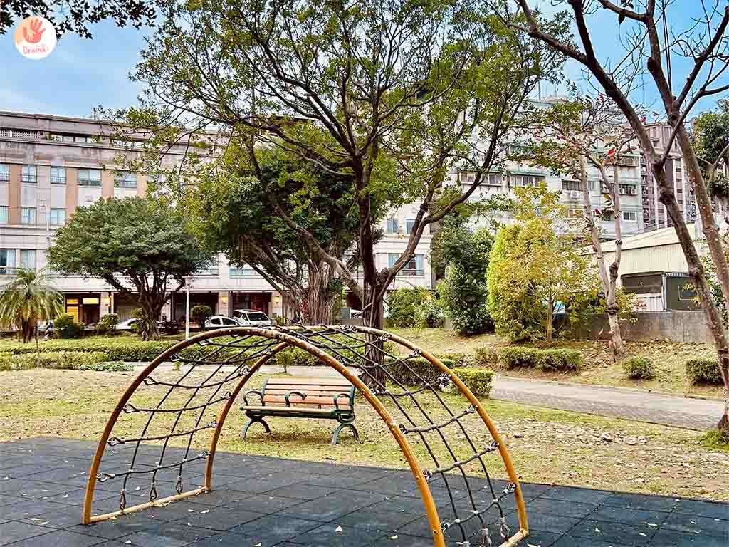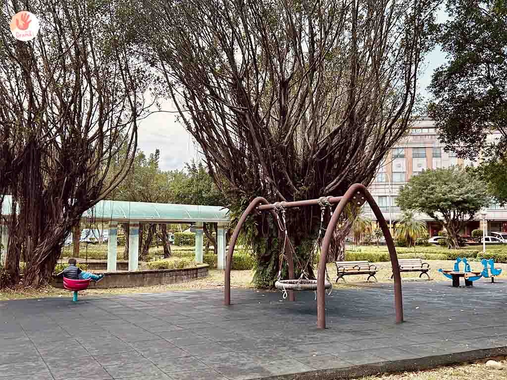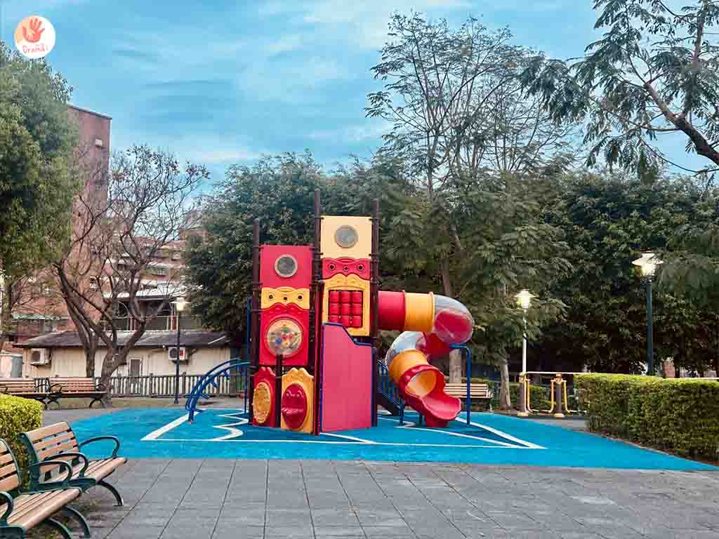 [尖山公園]是以國姓爺降妖傳說為設計主題,設有大砲造型的攀爬設施與妖鳥造型的溜滑梯和磨石子溜滑梯