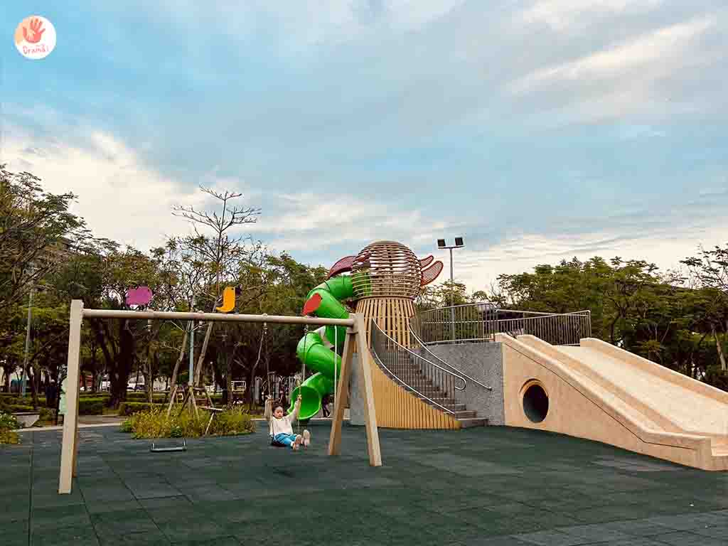 [尖山公園]腹地很大,妖鳥主題區的另一邊還有健身和傳統的遊具,有攀爬架和旋轉杯也有鳥巢鞦韆