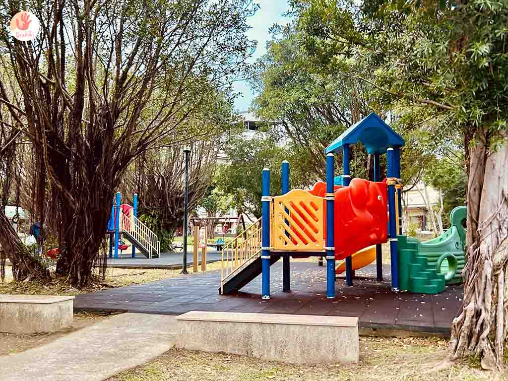 [老饕小館]鄰近十字路口還有一個社區型小公園,飯後小孩也可以再繼續放電