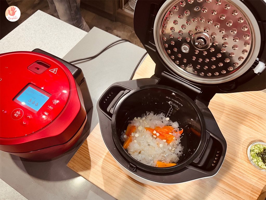 跟著食譜把準備好的食材都倒入[夏普SHARP智慧攪拌零水鍋]中,加入適量的水,不誇張一鍵按下去,寶寶粥就神奇的自動產出完成了