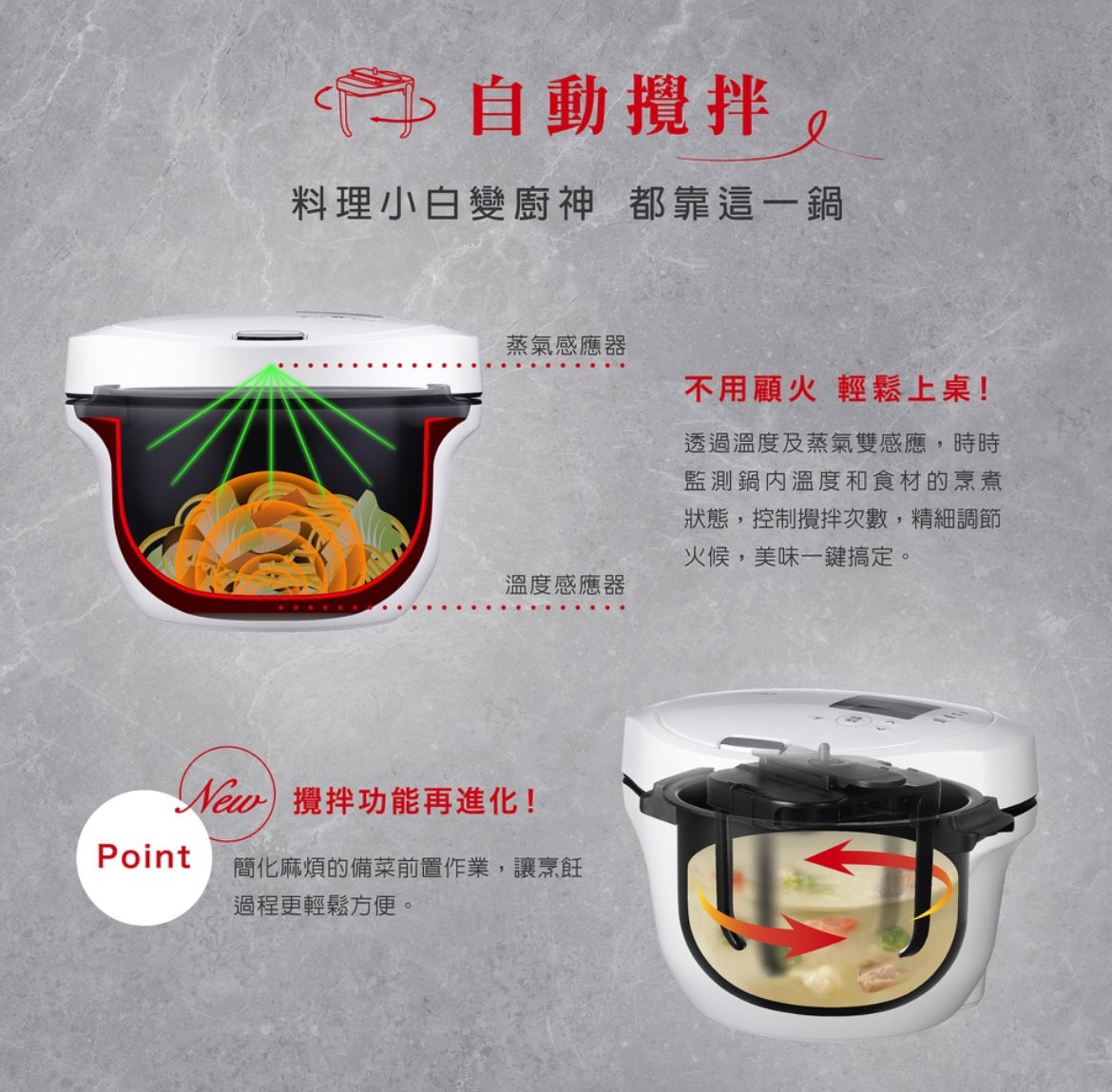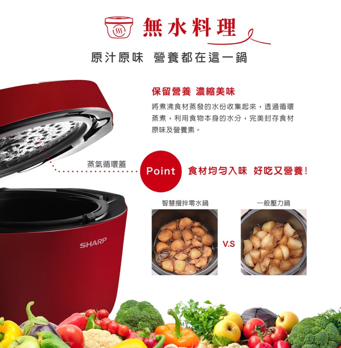 [夏普SHARP智慧攪拌零水鍋]2.4L能煮2~6人份,紅/白時尚機型設計,無水烹調、自動烹調、預約烹調一機搞定原汁原味的滿漢全席