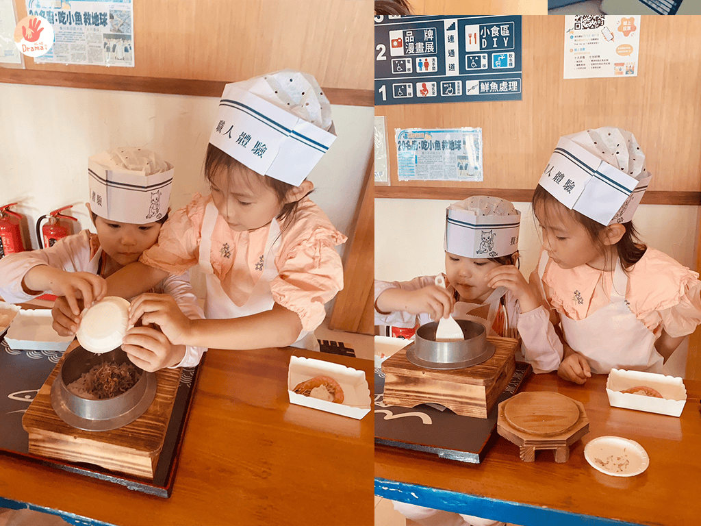 迫不及待要上樓試吃的我們,有吻仔魚和小蝦米,還有小魚干飯糰可以試吃